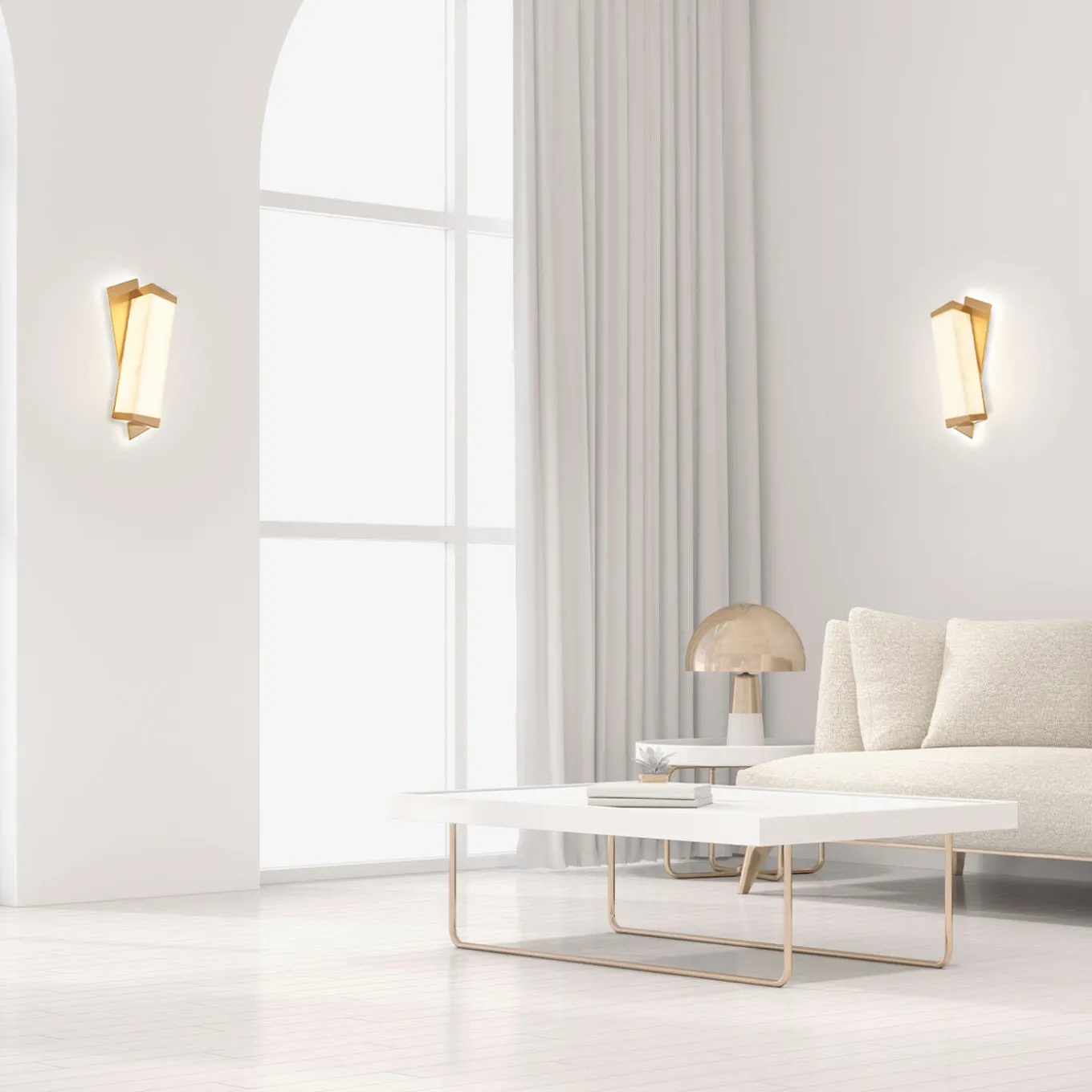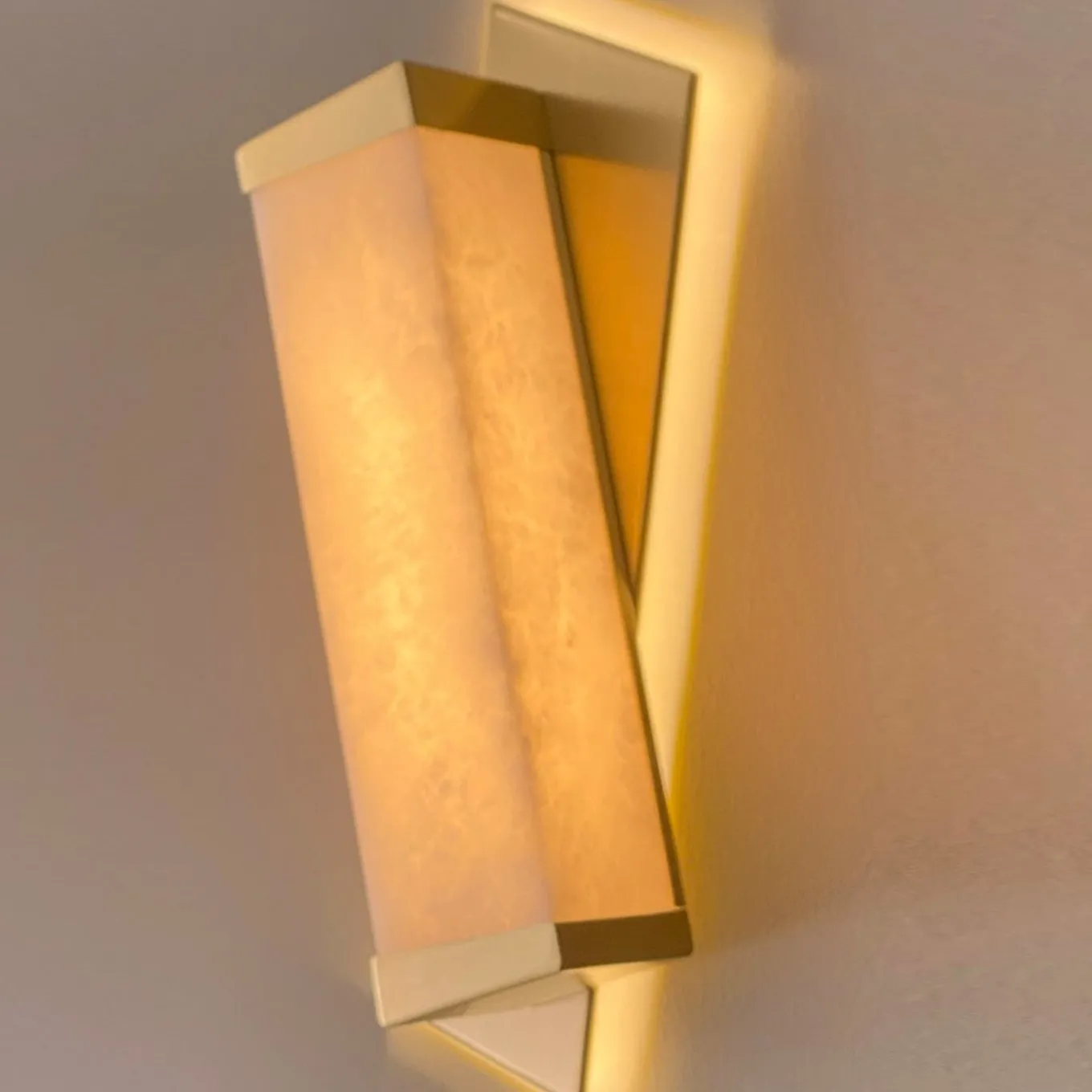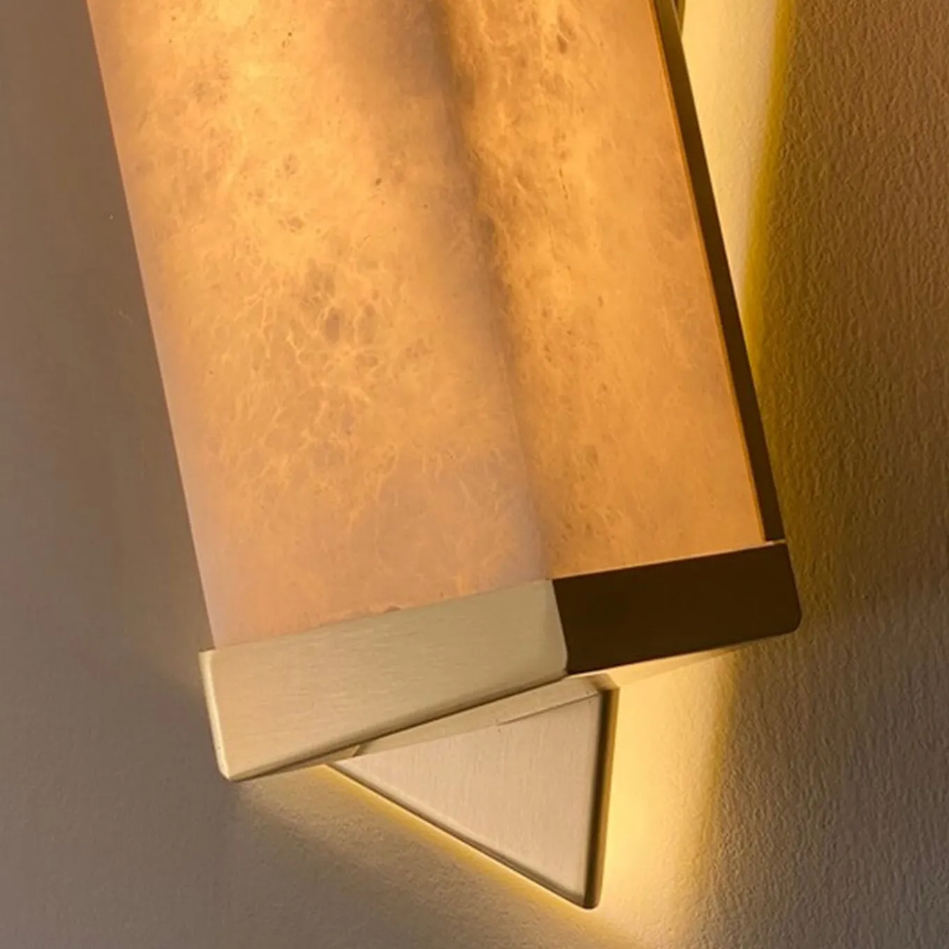 Wall sconce lamp Offset, with a 30’s flavor stressed by the alabaster diffuser and sharp geometric shapes. Led back lighting on the wall and the warm light diffused by the alabaster make this lamp a strong impact on the wall.