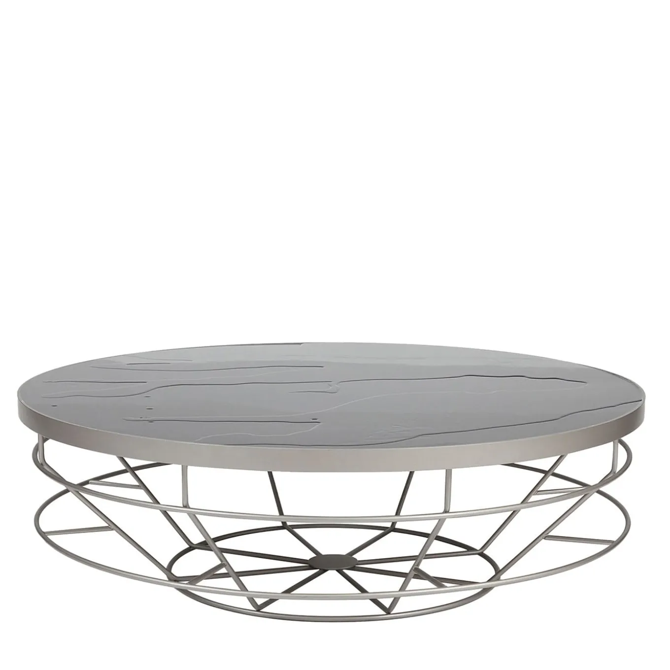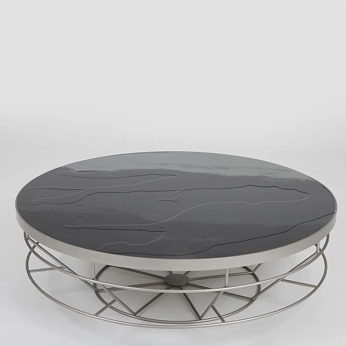 Contemporary design and traditional craftsmanship exquisitely merge in the sleek and clean lines of this gorgeous coffee table, an ideal complement for a sophisticated interior of modern style. Handmade of steel, the intricate and visually striking base supports a round top fashioned of epoxy resin, spread by hand to obtain singular shades. Available in a taller version, it is also customizable in shade and finish. Please refer to the Concierge for details.