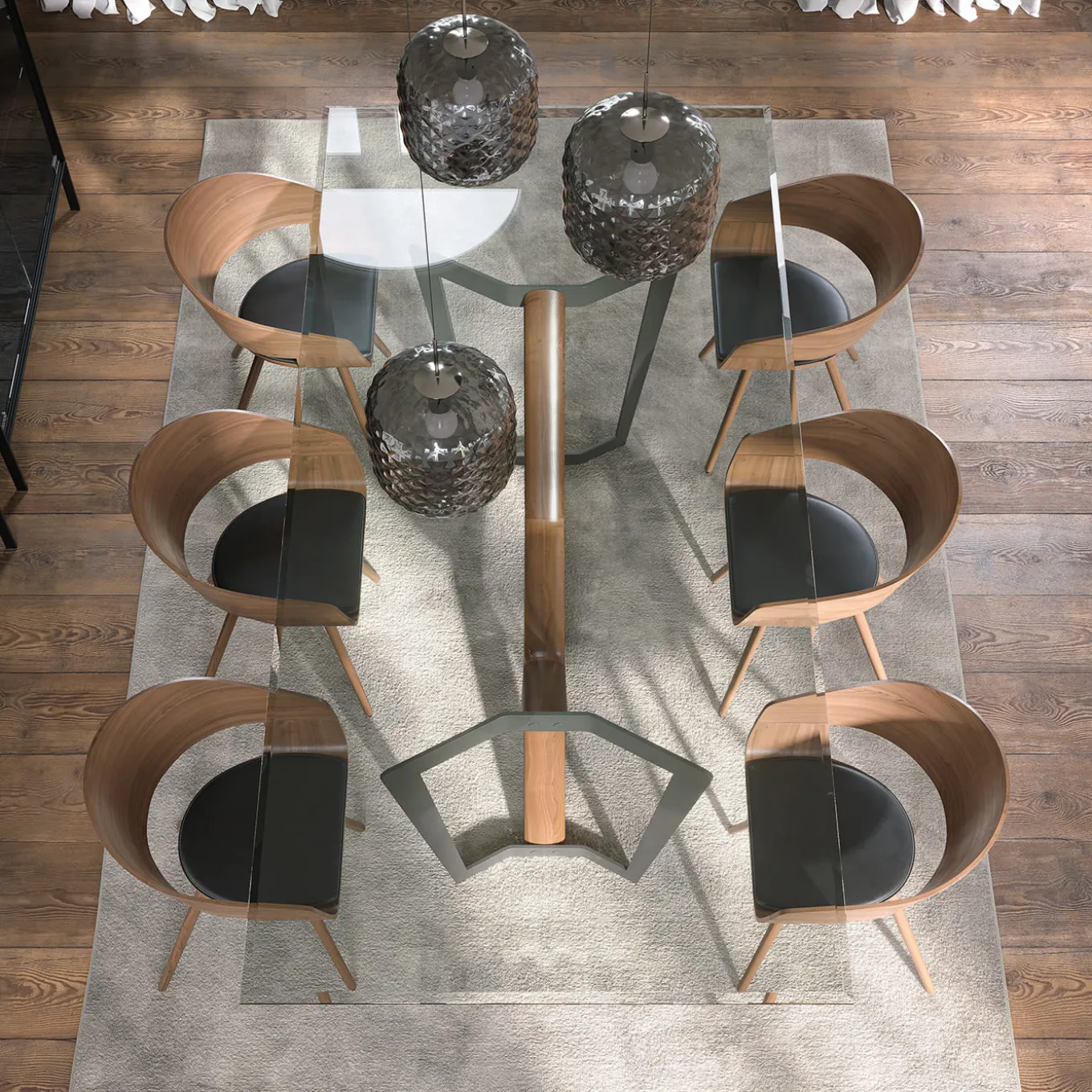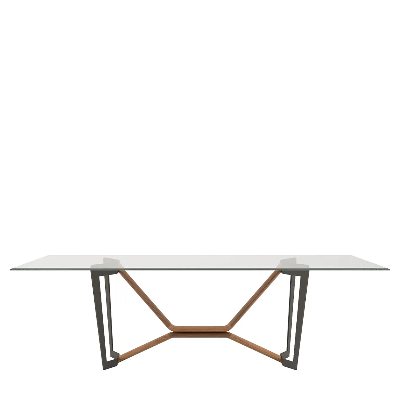 The Oliver table embodies a seamless architectural fusion of materials. Its base, crafted from stone bronze powder-coated metal and solid Canaletto walnut, elegantly supports a rectangular top in beveled extra-clear glass, creating a sophisticated balance of strength and transparency.