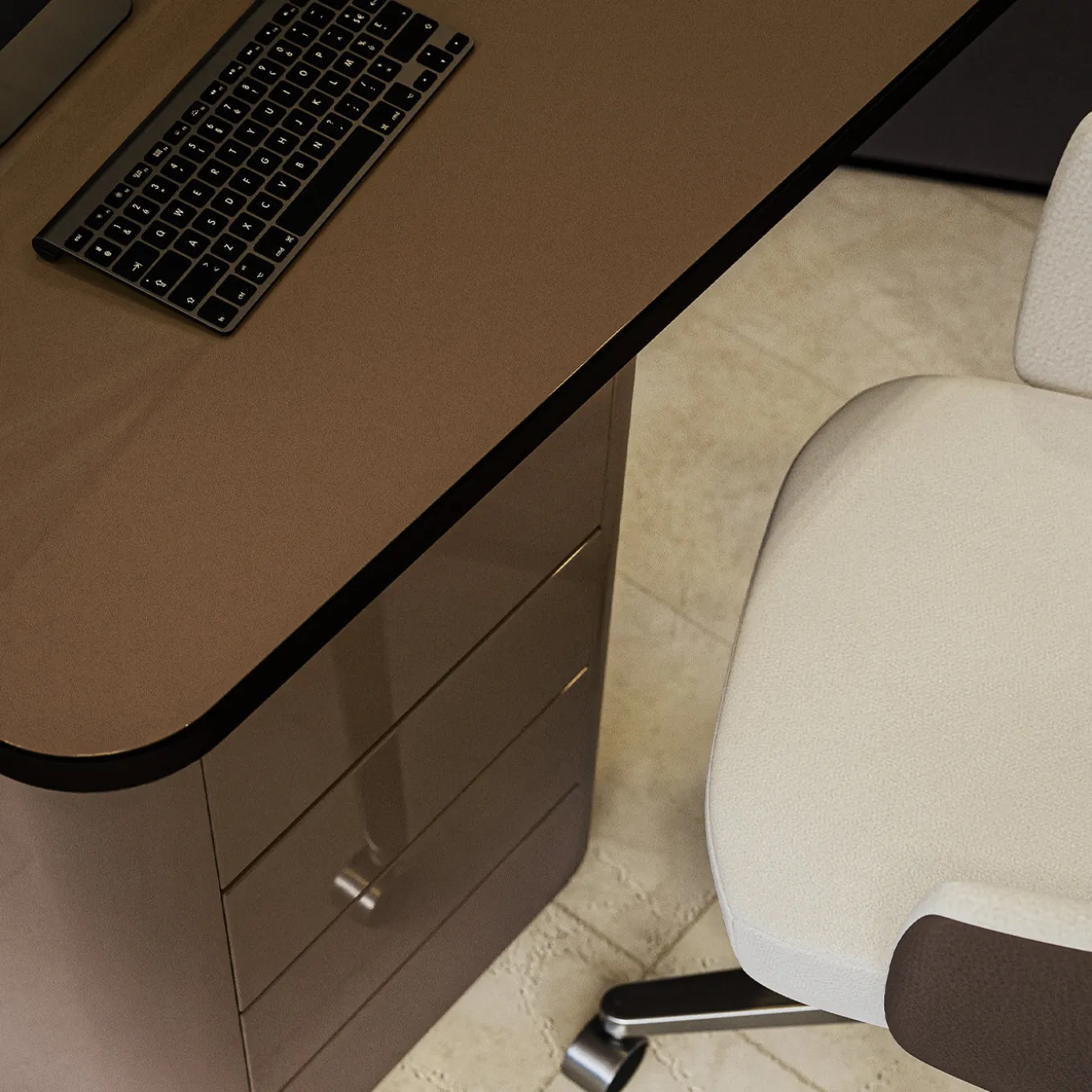 The Olivia swivel chair features an ergonomic silhouette with plush foam padding and a soft bicolor leather upholstery, combining brown on the exterior with light gray on the interior. Its polished metal base includes five wheels for smooth mobility, making it a practical and comfortable choice for office environments.
