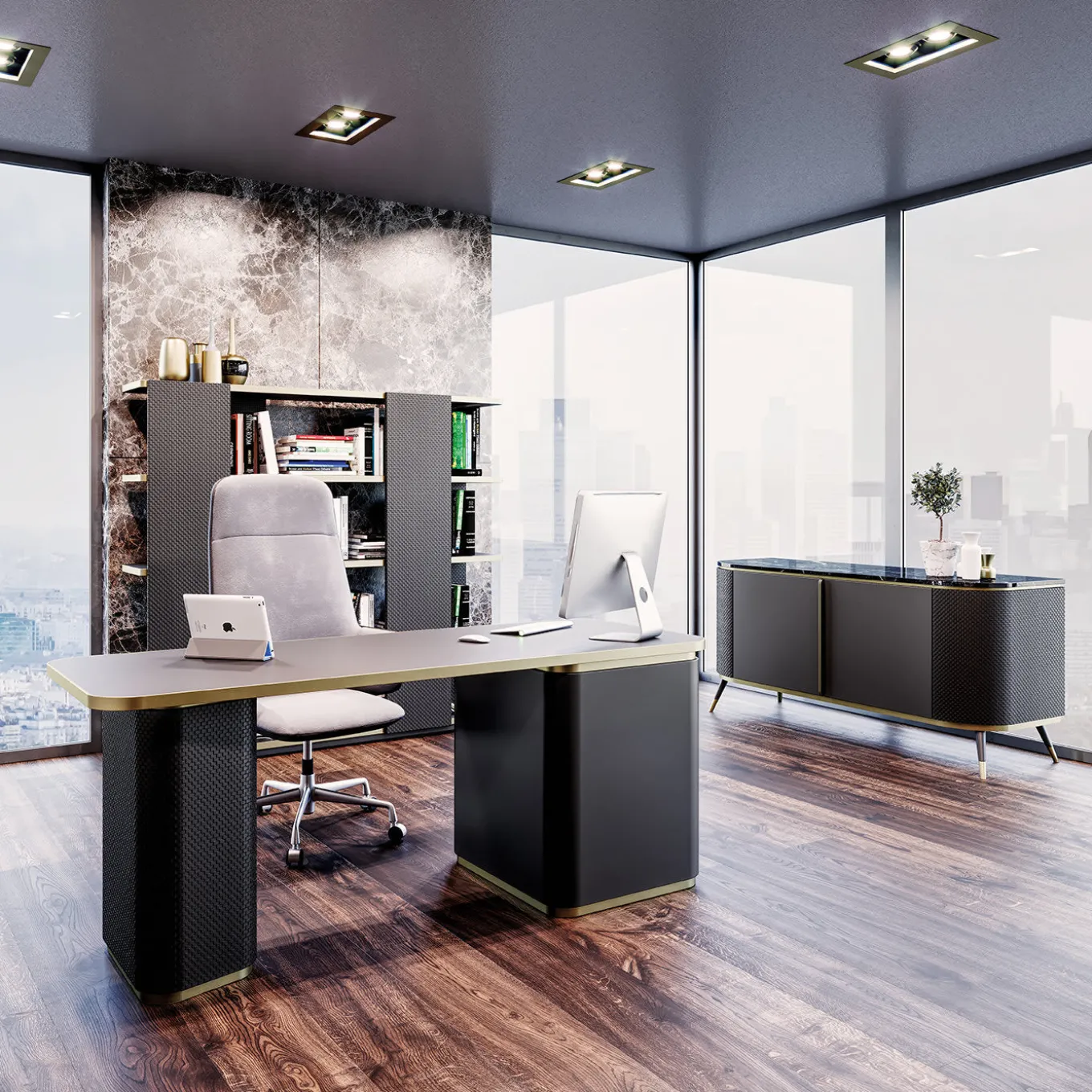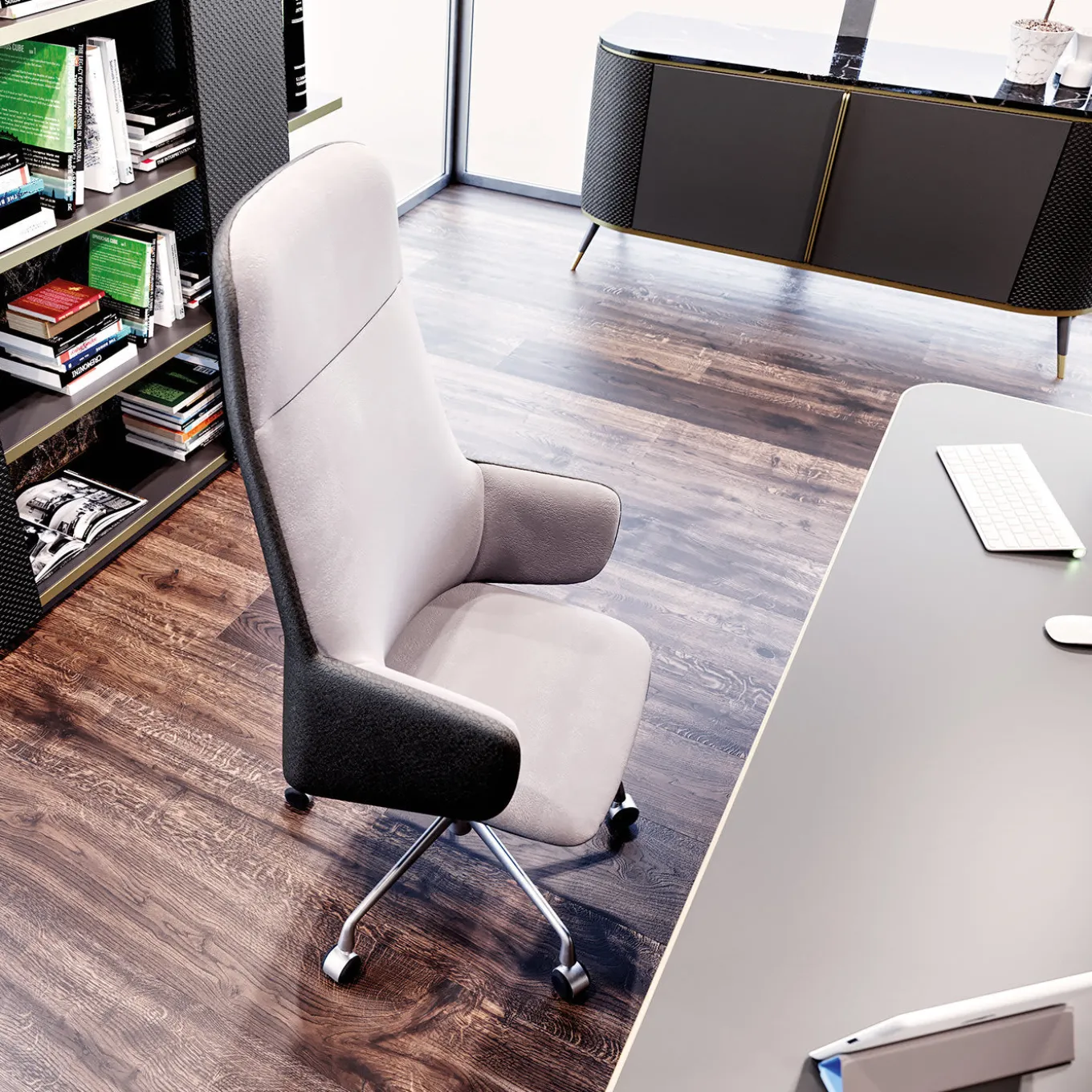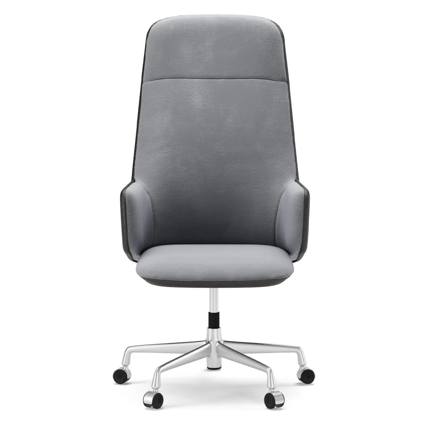 This eye-catching swivel armchair is expertly designed to offer maximum comfort of use. The ergonomic silhouette comprises a wooden frame padded with foam and showcases a two-toned, soft upholstery. Prized brown leather covers the external surface of the seat, while the inner portion is covered in light gray leather. The glowing metal base is equipped with five wheels allowing optimum movement.