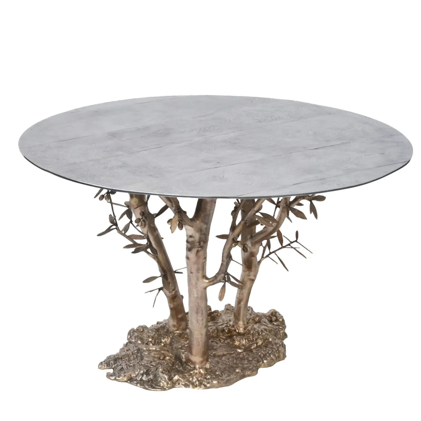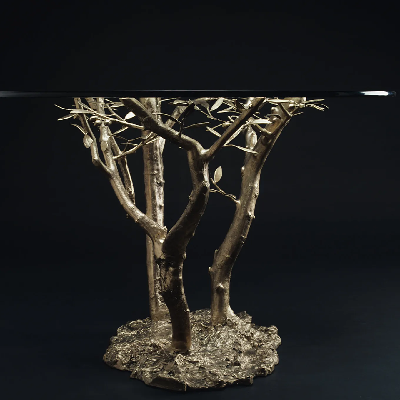 The Olivo dining table features a distinctive base crafted from natural bronze casting, intricately designed to resemble tree trunks and branches. The tabletop is made from natural aluminum casting, providing a contemporary contrast to the organic base. Available with a customizable table surface size and an option for a glass top, this table combines artistic detail with functional design ideal for various dining settings. Contact the Concierge for more details.