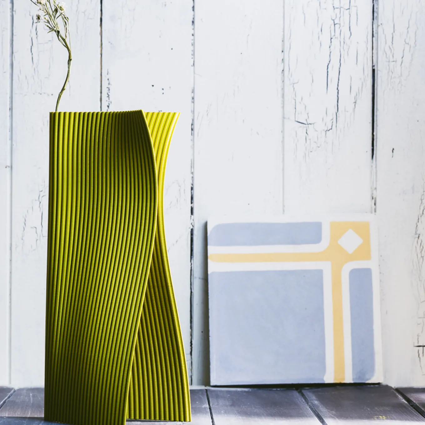 The Onda yellow decorative vase features a graceful, sinuous design that captures the fluid motion of water in continuous change. Standing 30 cm tall, its elegant rippled lines evoke a sense of lightness and unpredictability. Made with innovative digital craftsmanship, each piece may show slight variations in color and texture. Designed for indoor use, the vase includes a glass container suitable for holding liquids; plastic parts are sensitive to UV light and should be kept out of direct sunlight. Made from eco-friendly, plant-based PLA using 3D printing technology, this digitally crafted vase is not mass-produced and comes in various colors. Please Contact the Concierge for available options.