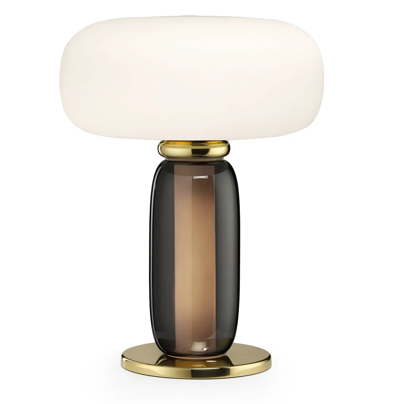 A fascinating combination of hues and materials, this table lamp will make an elegant addition to a console or writing desk in both a modern or traditional home. Delivering a strong, powerful presence, it is fashioned of polished gold-finished brass and dark-colored glass, and is completed with a large drum shaped white shade. Please ask the Concierge for details and customization options.