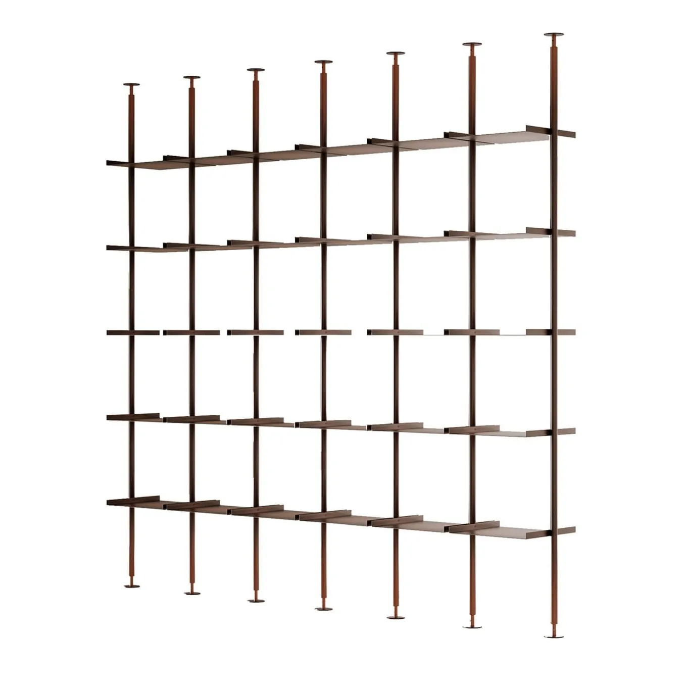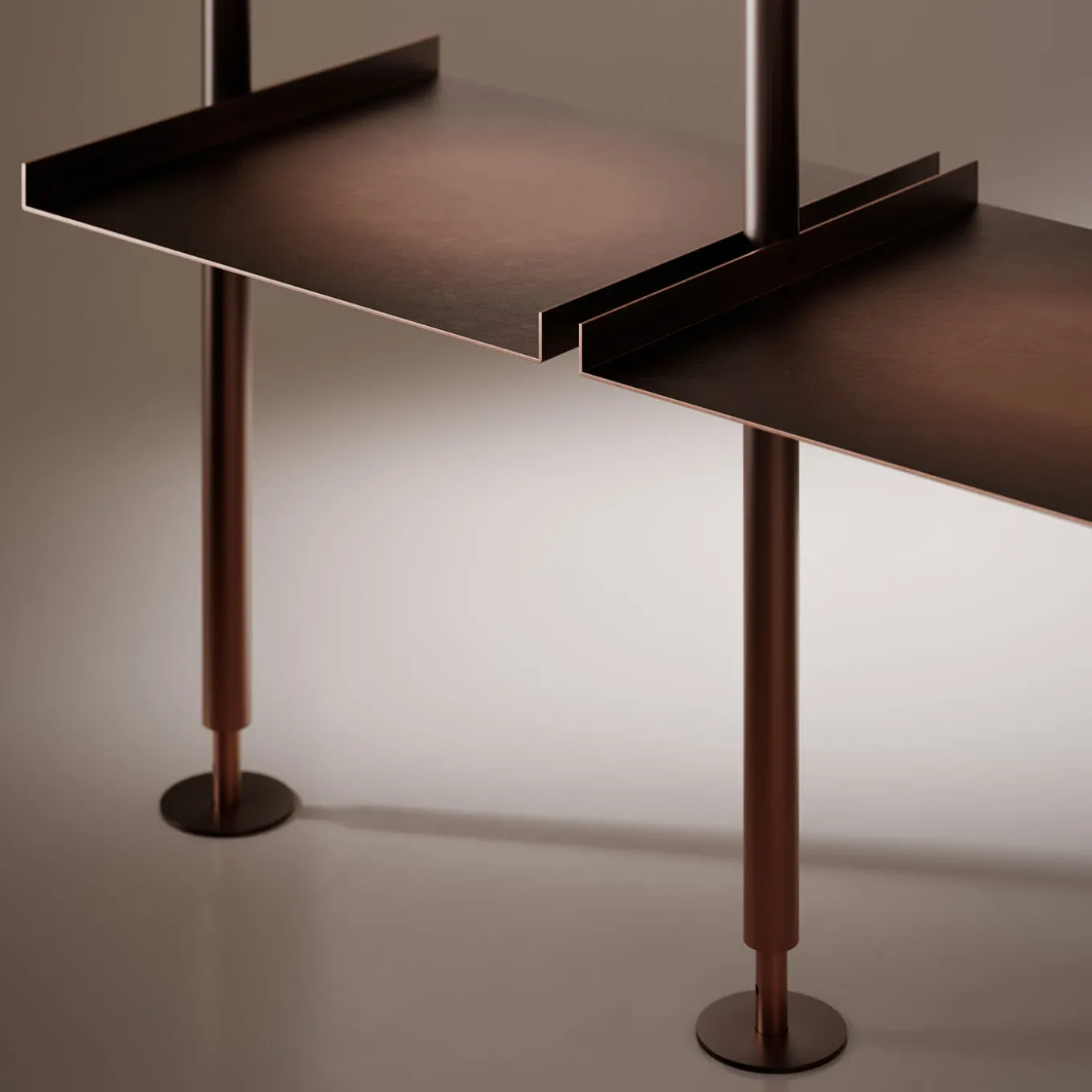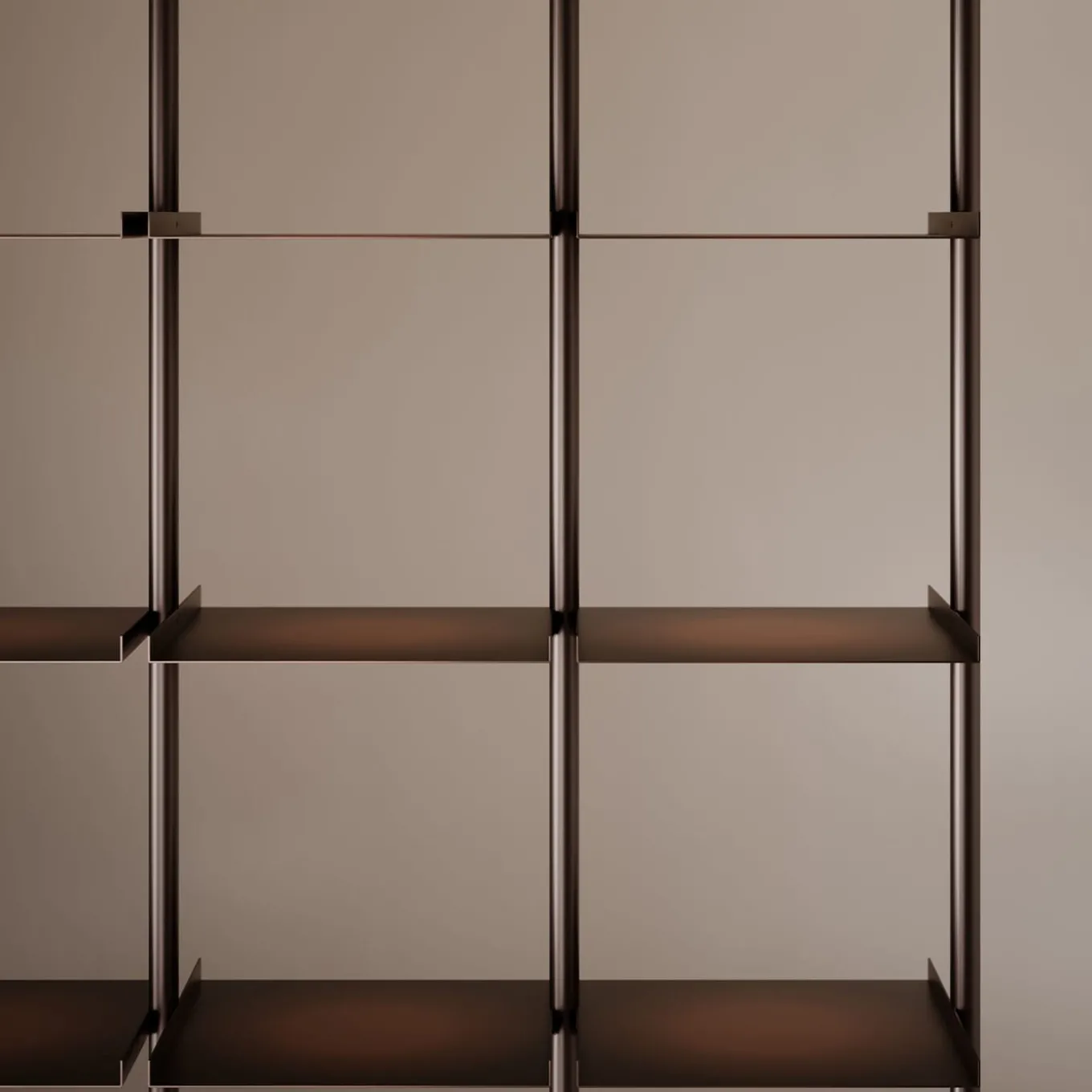 The Open Bookcase is a system characterized by formal precision, created to divide and organize spaces. Its geometric design highlights the clean lines of its blended burnished copper structure, which consists of height-adjustable vertical rods and shelves, softened by meticulous hand finishing. This system expands the possibilities for composition, enabling various modular configurations.
