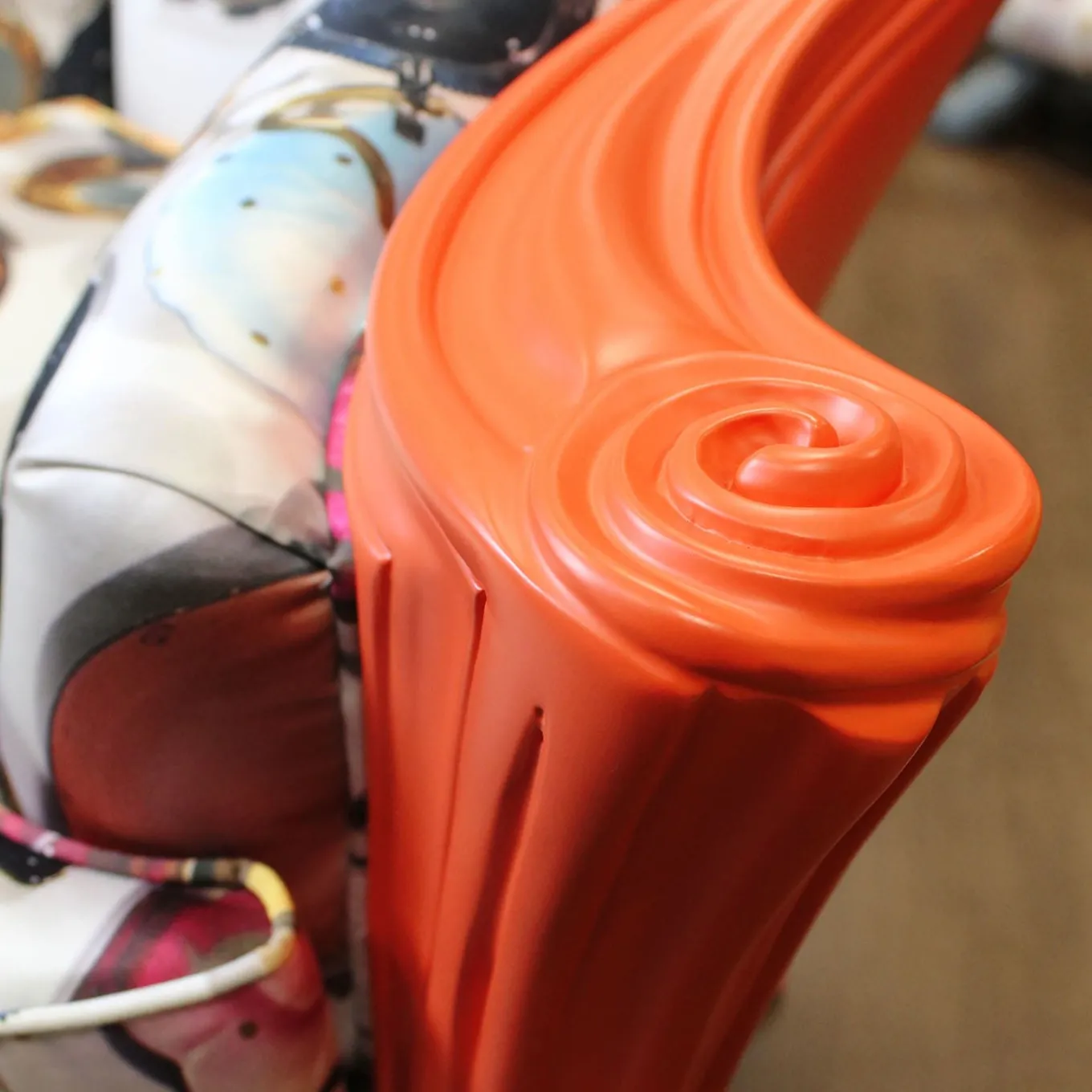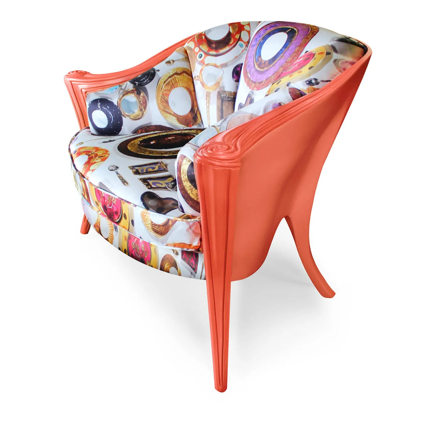 Carved wooden structure with matt orange lacquer finish on back, armrests and front legs; upholstered with Apres Tout fabric, designed by Carlo Rampazzi.