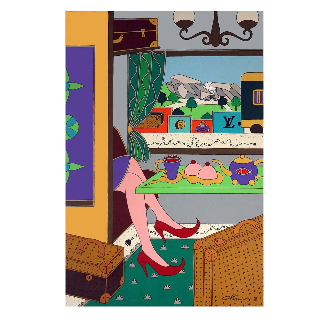 A fantastic, surrealist journey on the iconic train through the most evocative places on Earth, this acrylic painting is part of the Orient Express project started by artist Giampaolo Atzeni in 2001. Painted on canvas and mounted on a wooden support, this unique artwork comes with an authenticity certificate. Please consult the Concierge for further information.