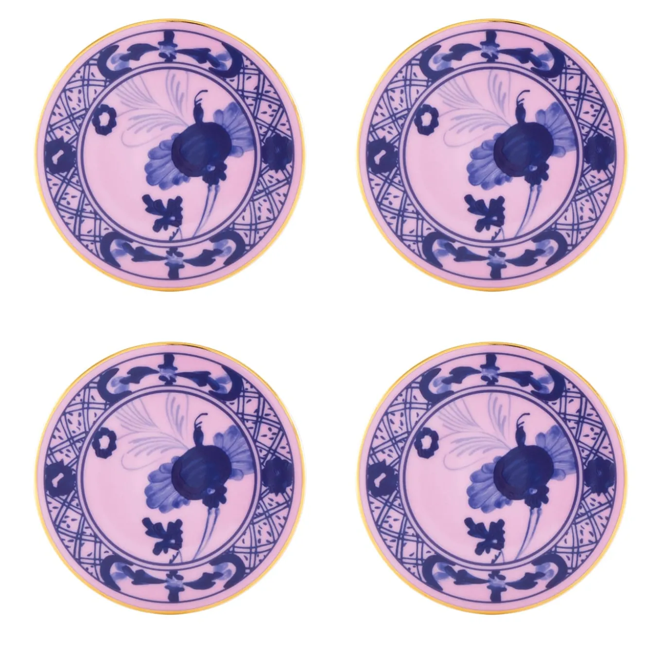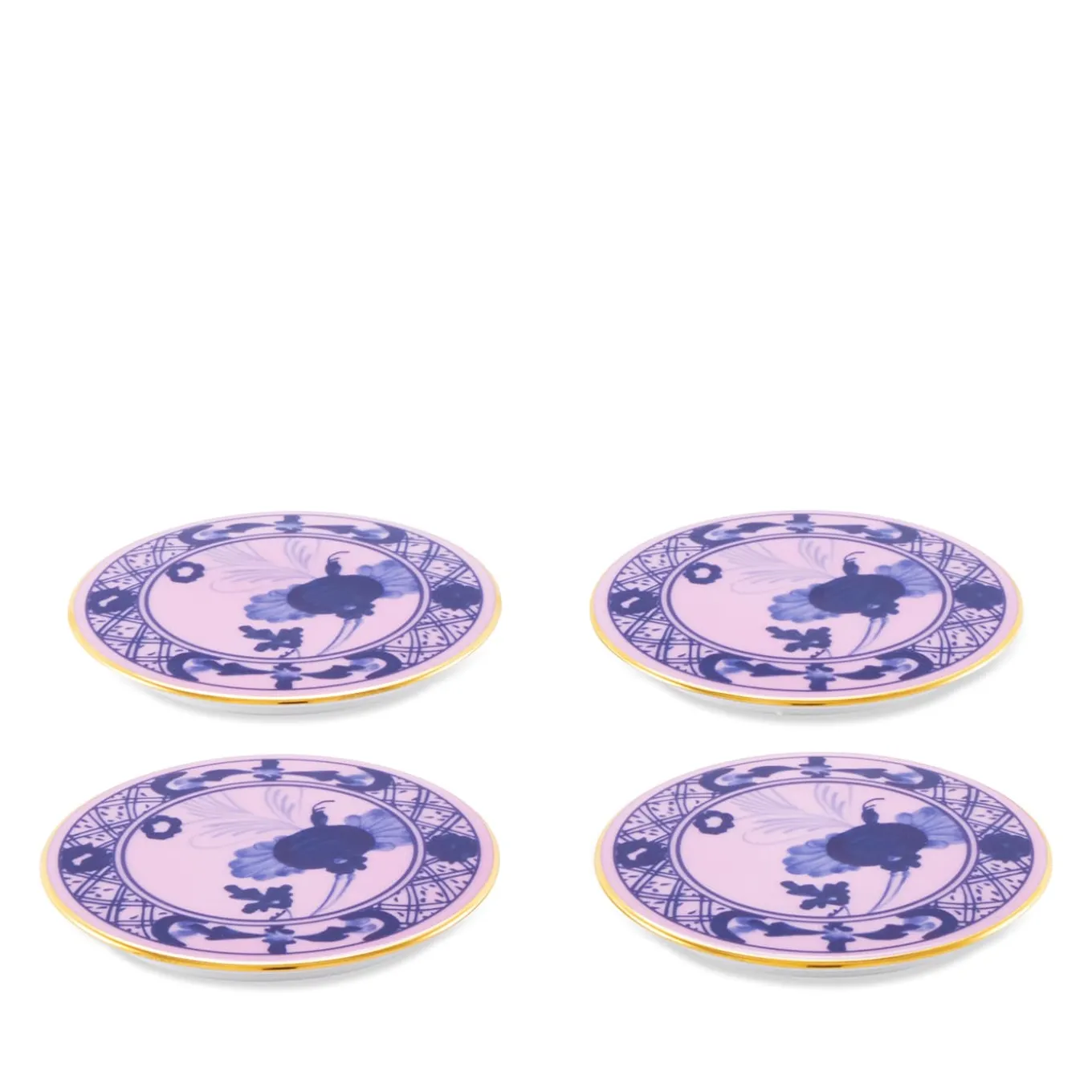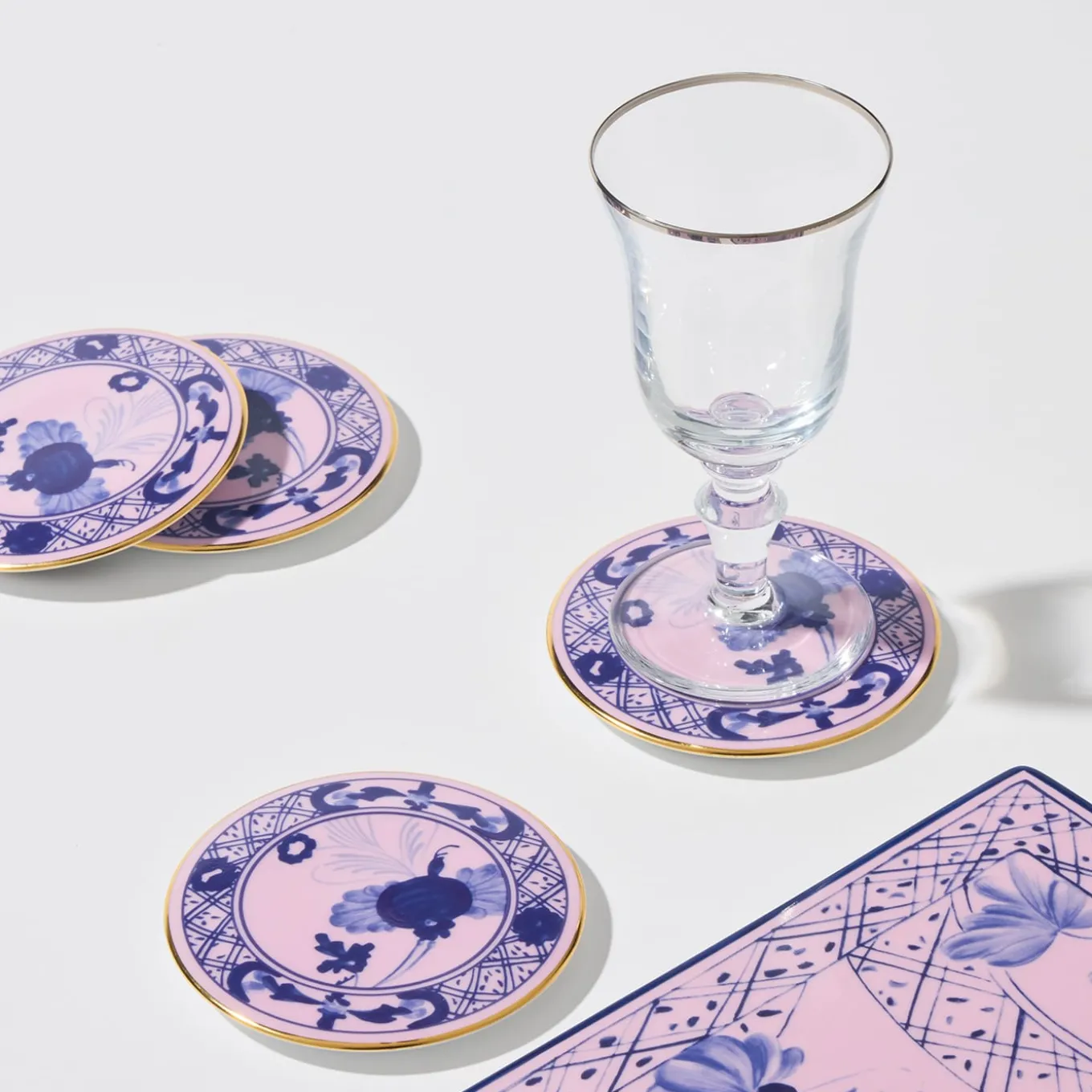 Set of 4 Azalea Porcelain Coasters, from the Oriente Italiano Collection. These four porcelain coasters, featuring vibrant floral patterns. The gold trim highlights the beauty of the Azalea pattern, Perfect for everything from backyard cocktail parties to intimate dinners, these colorful coasters add a distinctive touch to your décor. With its oriental-inspired colors and craftsmanship, each piece in the Oriente Italiano collection is a true work of art.
