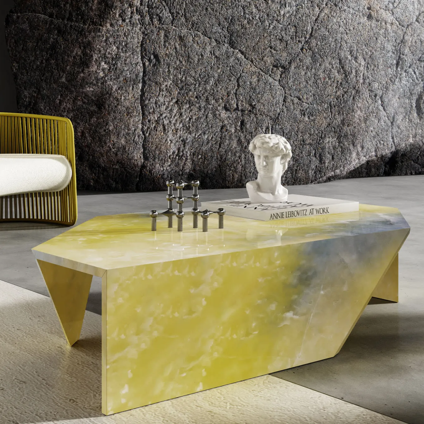 Rigorously bent to craft a self-supporting structure poetically inspired by origami art, this coffee table is fashioned of prized Iranian white onyx enchants with its vibrant shades of chick yellow, lime green, and blue, obtained with a deft manual watercoloring process. The unpredictable cloudy motif onyx naturally flaunts further underlines its uniqueness.