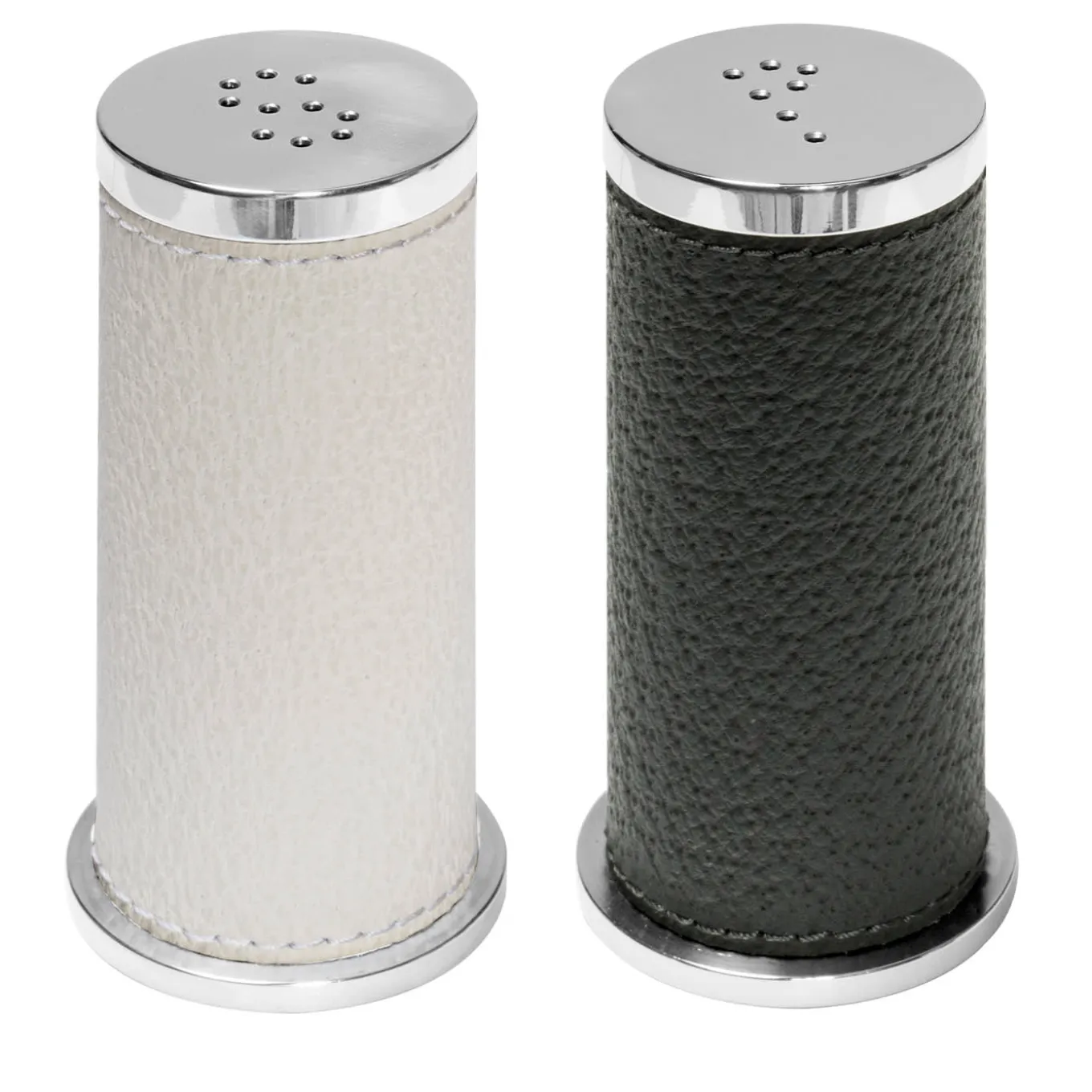 Adding sleek elegance to a contemporary table, this set of salt and pepper shakers will be a sophisticated accent on any occasion. The stainless steel cylindrical silhouette of both pieces is adorned with fine brown leather, with a beveled top to reduce spilling and a screw-on bottom that allows easy refills. This set can be paired with the Otello Salt & Pepper Mills for freshly ground salt and pepper.
