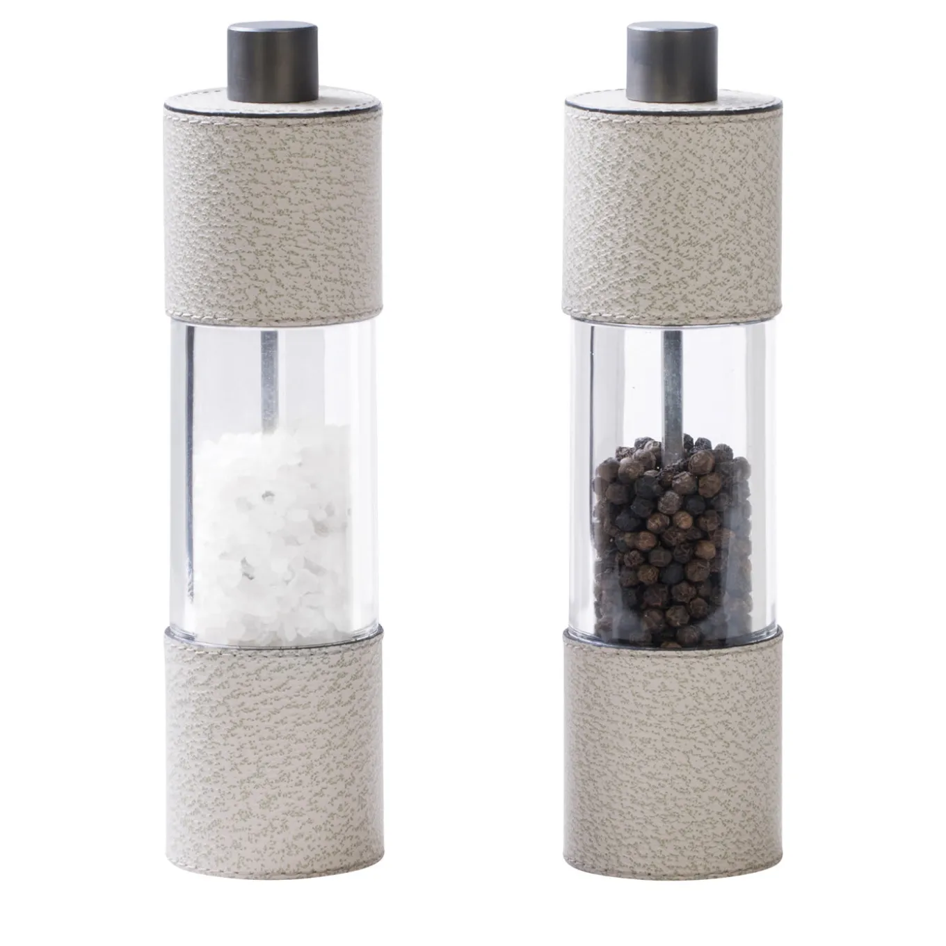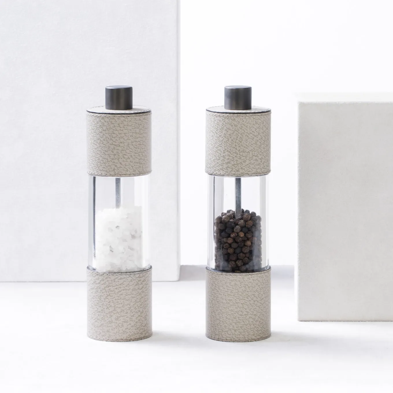 A striking addition to a contemporary kitchen or minimalist dining room, this set of salt and pepper mills is eye-catching and sophisticated, while also providing a precious service while cooking and seasoning. The stainless steel cylindrical structure at top and bottom its clad in leather and features a metal knob with a bronze finish at the top, while the central glass cylinder allows monitoring of its contents. Thanks to the ceramic grinder, it is possible to obtain a fine to coarse texture. Other metal finishes are brass and chrome.