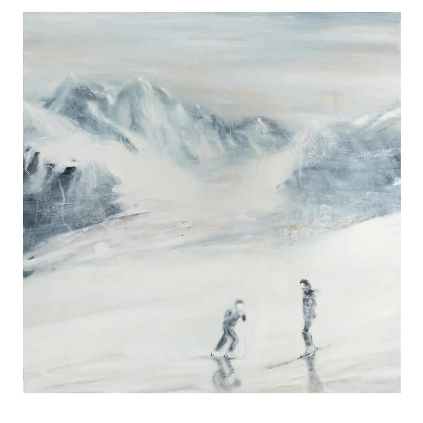 A serene and captivating scene unfolds in “Ouka Ski Lesson” by Angelo Bellobono, where the vastness of a snow-covered landscape is beautifully rendered in soft, muted tones. The acrylic on canvas painting evokes a sense of tranquility and quiet adventure, with two lone figures navigating the expansive white terrain. The delicate brushwork and subtle gradients of color create a soothing atmosphere, inviting the viewer to feel the crisp air and peaceful solitude of the moment.