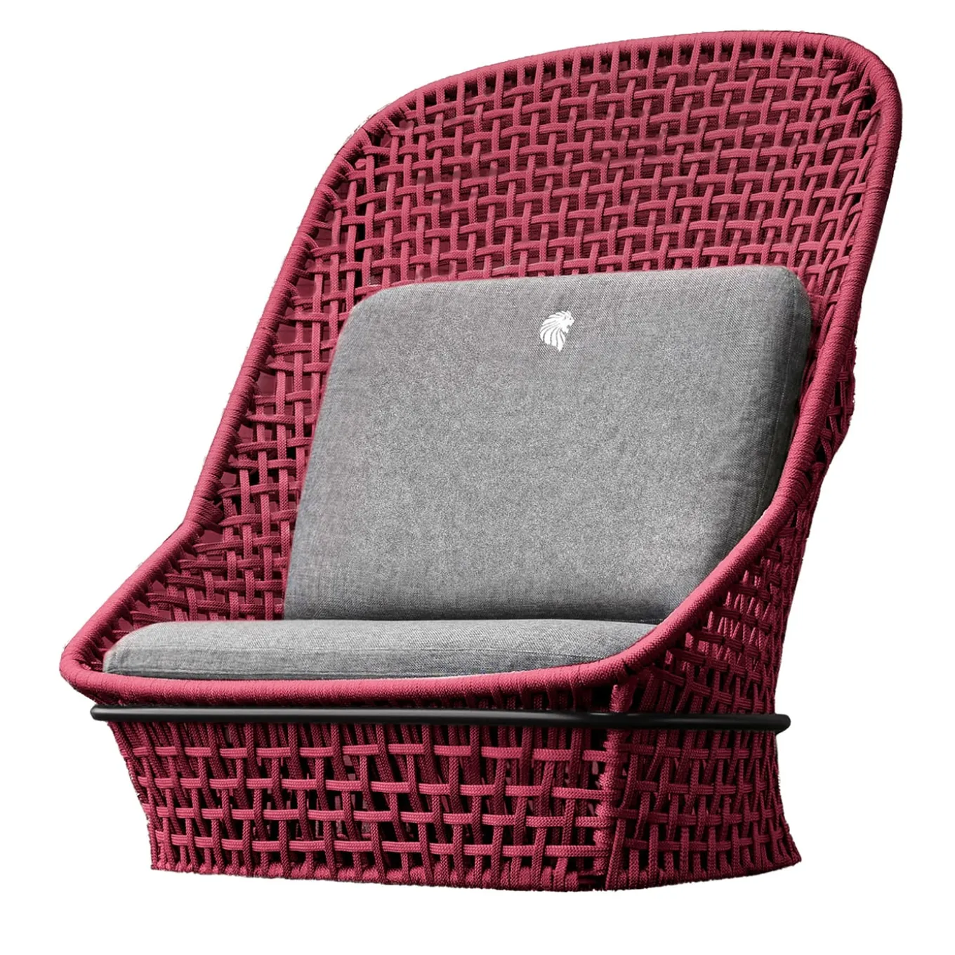 Outdoor occasional chair with high back available in specially treated fabric. Cushion filling in waterproof dacron. Structure in a combination of satined black metal treated in cataphoresis with inserted Giorgio Collection logo and amaranth woven cordage. Special outdoor cover included in the price. Design by Castello Lagravinese Studio. Please, contact the concierge for customization of the fabric.