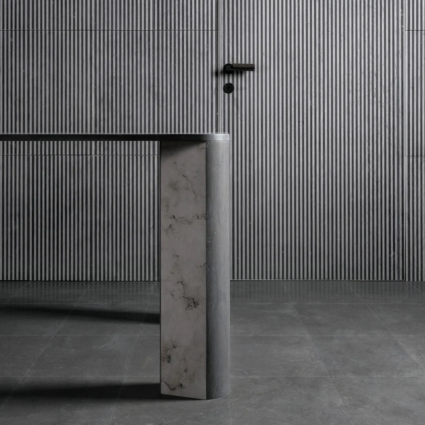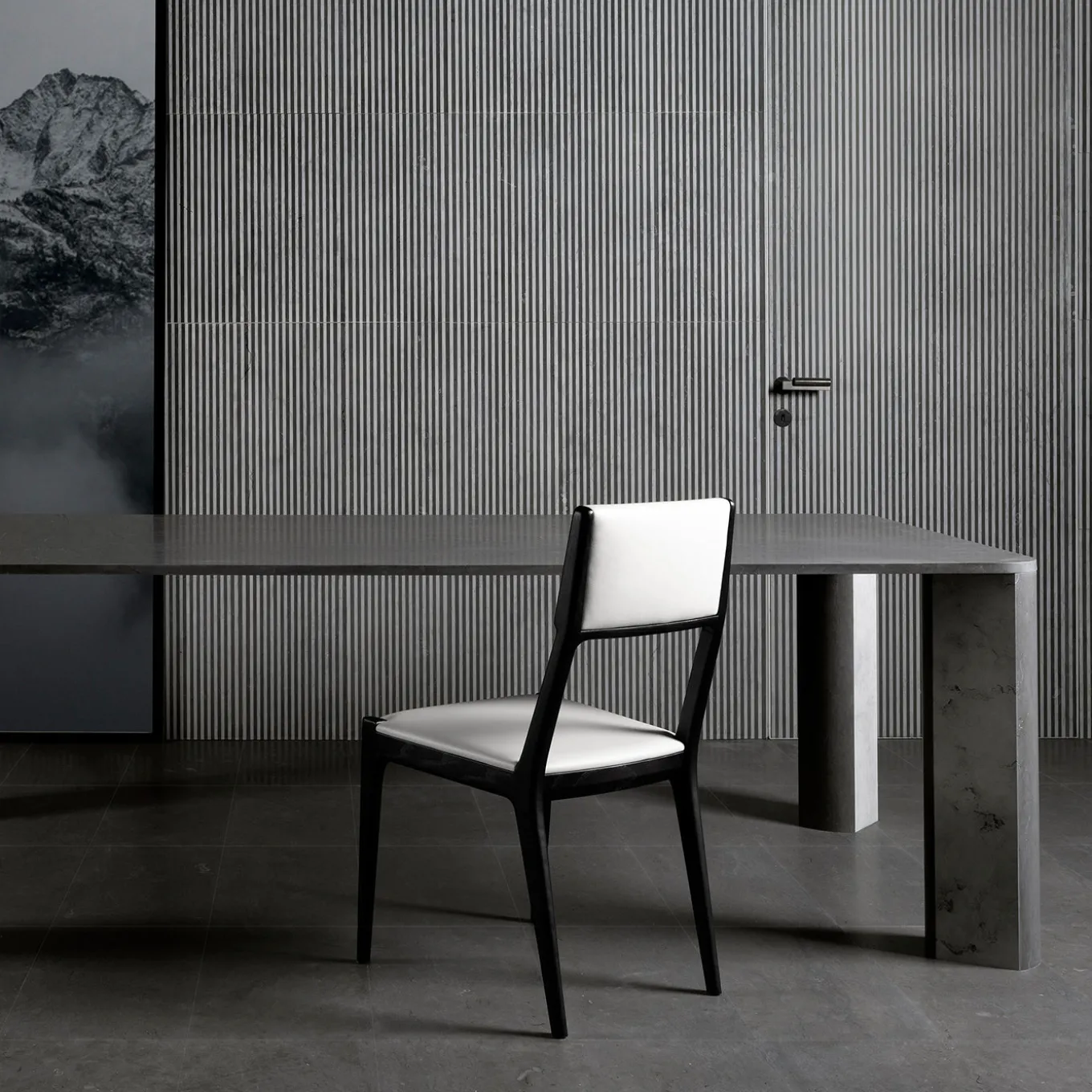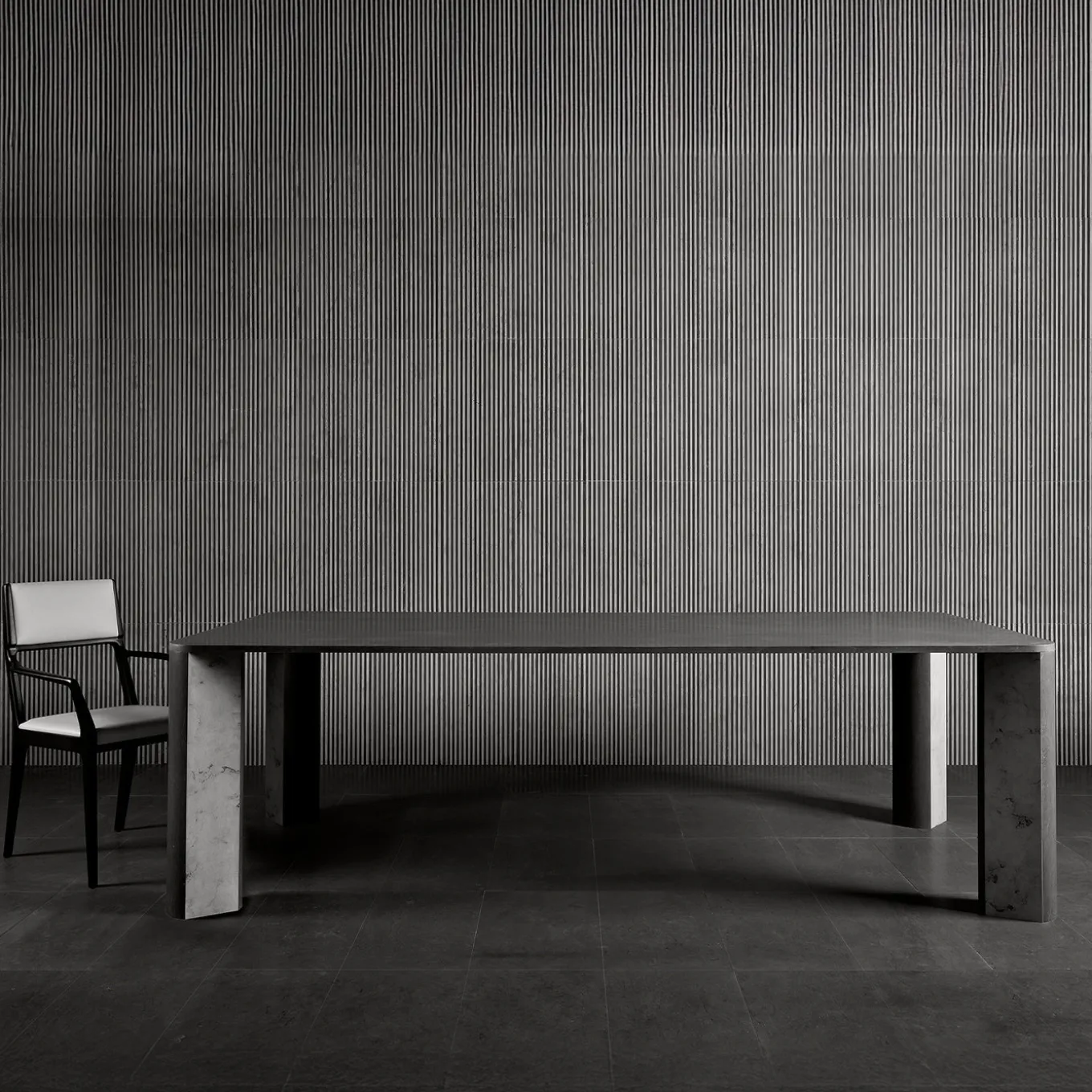 A rectangular dining table characterized by essential lines and a composition of smooth, geometric solids. Its three-dimensional marble surface textures overlap with natural veining, creating unique visual combinations. The leg features a cylindrical form split to reveal an inner decorative texture, blending structural strength with refined aesthetic details, ensuring harmony between the table and its surrounding environment.