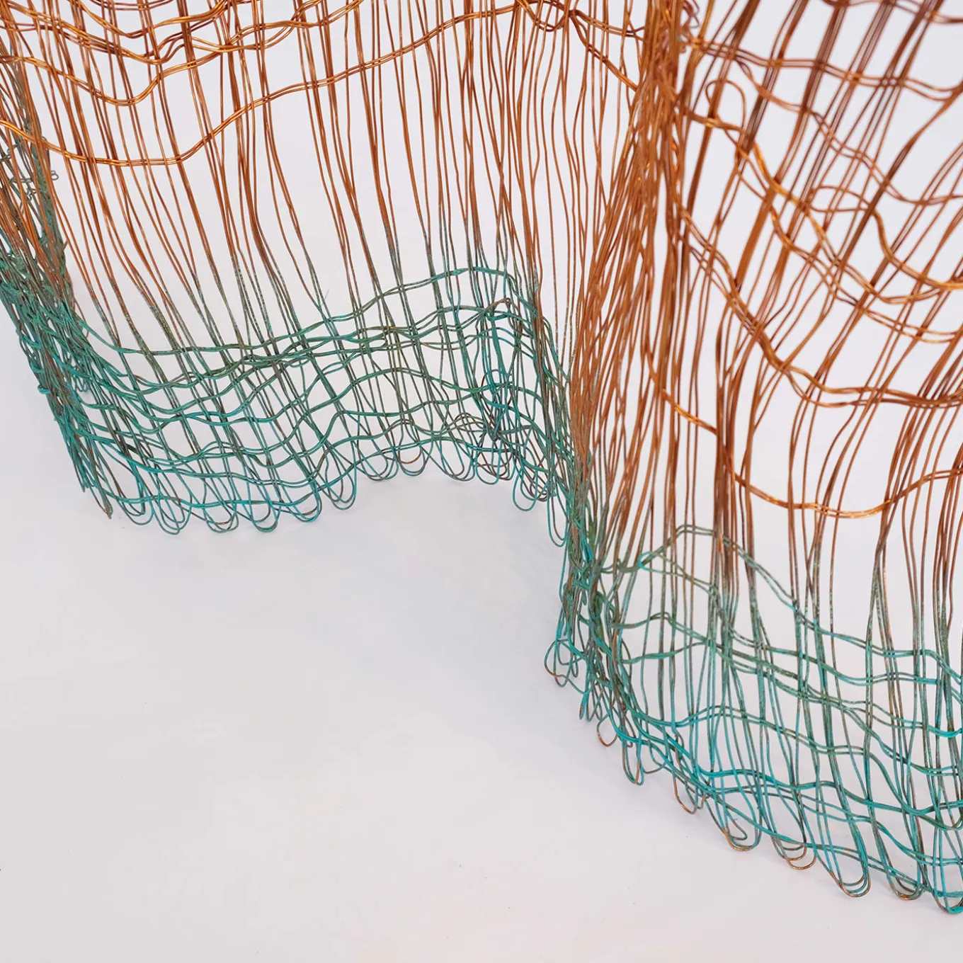 Belonging to the Paesaggi Alchemici Collection consisting of pieces fashioned of handwoven copper threads, this piece is crafted using traditional textile looms. Exuding an utterly dynamic character, its shape can be changed according to personal preferences. Boasting oxidized verdant and natural shades, it can be used in both indoor and outdoor decors.