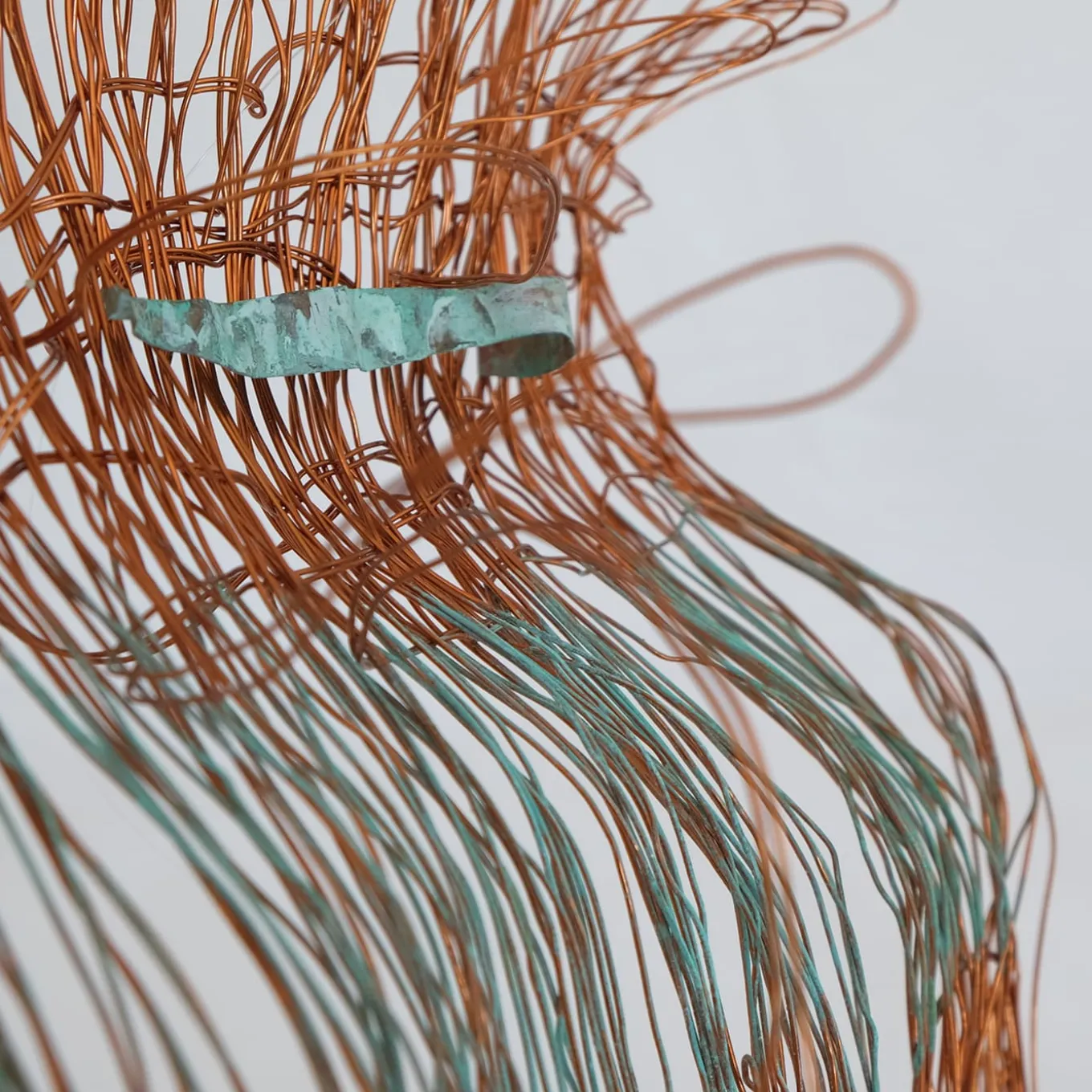 Stunningly handwoven with a traditional loom used for tapestry and rugs, this magnificent sculpture is entirely made of copper threads. A singular oeuvre from the Paesaggi Alchemici Collection, it embodies pure dynamism and movement, enhanced by shaded tones of natural copper and oxidized green. Its shape can be molded and changed according to personal preference or decor needed. Can be showcased both indoors and outdoors.