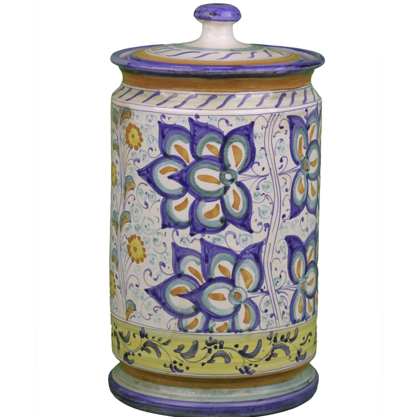 This exquisite vase was crafted entirely by hand and hand painted as well. The decoration featured on this piece, crafted in the shape of a pharmacy jar of the late-medieval period, was inspired by the traditional Palmetto Persiana motif, enriched by a yellow band on the bottom with the inscrtiption, “Aqua di Salvia”, on its base. Ancient Tuscan techniques were used in the crafting of this product that is for decorative purposed only. It is not safe for use with food.