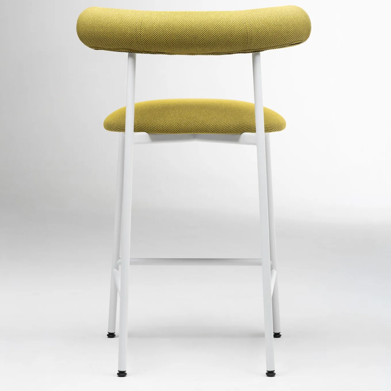 Ideally gathered with twins around a modern, total-white kitchen island, this stool is the perfect synthesis between comfort, sleekness, and color. Both the enveloping, cylindrical-cut backrest and 65cm-high seat are generously stuffed and wrapped in a vibrant lime-green fabric upholstery (recycled PET – cat. C), while the steel frame is powder coated in pure white.