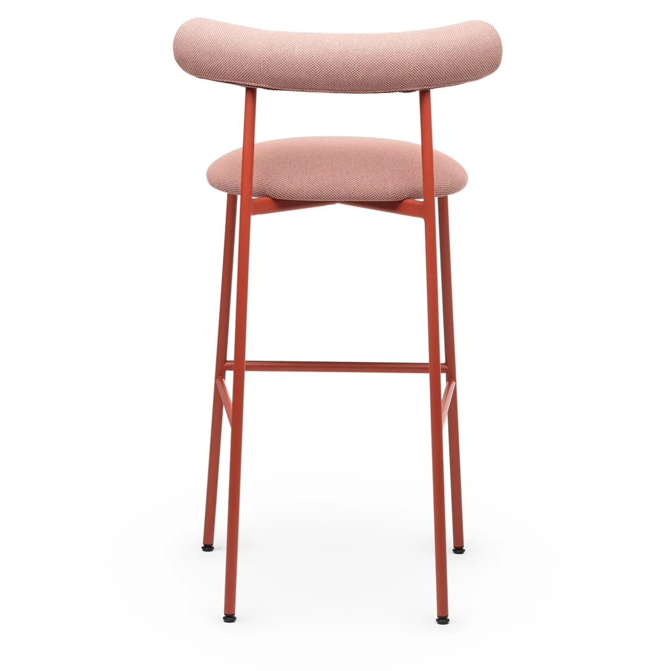 A stylish color combination meets simple geometry in this sleek stool designed by Studio Pastina for the Pampa series. Upholstered in a romantic pink-toned fabric (100% recycled PET – cat. C), the plush seat and embracing, cylindrical-cut backrest stand in neat yet harmonious conflict with the brick red powder varnish of the slender steel frame. Other versions are in the Artemest catalog.