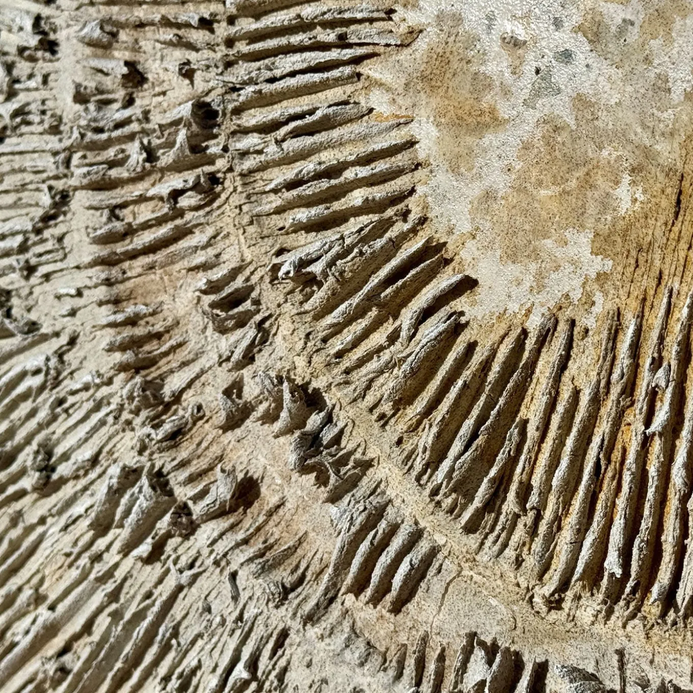 Inspired by the meeting of man and marine life, this one-off piece by Mara Fabbro features a central, radiating shape, whose texture and grit gives the illusion of movement. It is entirely crafted using a sandy mixture and ochre and blue pigments, most evident in the central ring. This piece will undoubtedly shine in an eclectic and modern interior, where it can be admired by artists and afficionados, alike. Each painting is unique.