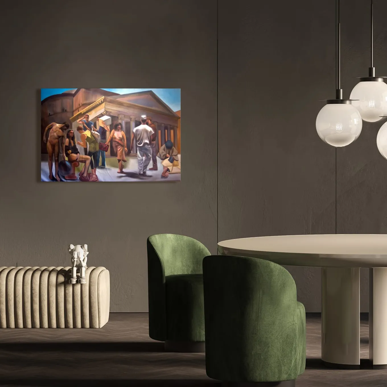 A combination of figures from everyday life, working, posing for a shoot, or simply walking through a city lends this oil on line painting its obvious pantomime atmosphere. With a deft depiction of the Pantheon in the background, all these people showcase the typical traits of Federico Lombardo’s painting, with its generous use of color applied with bold brushstrokes.
