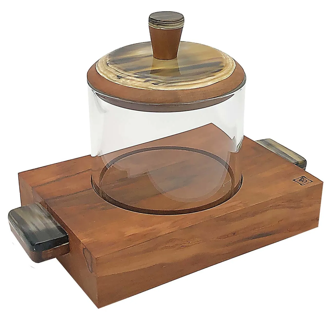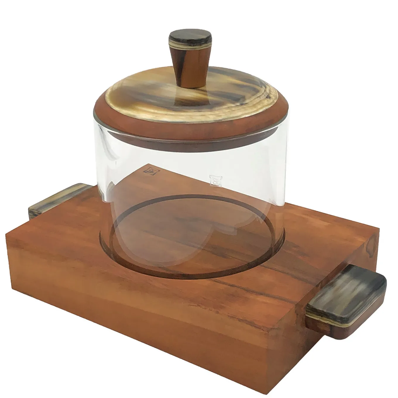 Quality, fine detailing, and passion are the characteristics that distinguish Stefano Raffa’s handmade creations. This truffle holder is a simple yet entirely glamorous object of functional decor that will add a modern elegance to any dining table. Supported by a rectangular base of pear wood with cow horn handles, the borosilicate container features a round lid with a conical finial with horn details.
