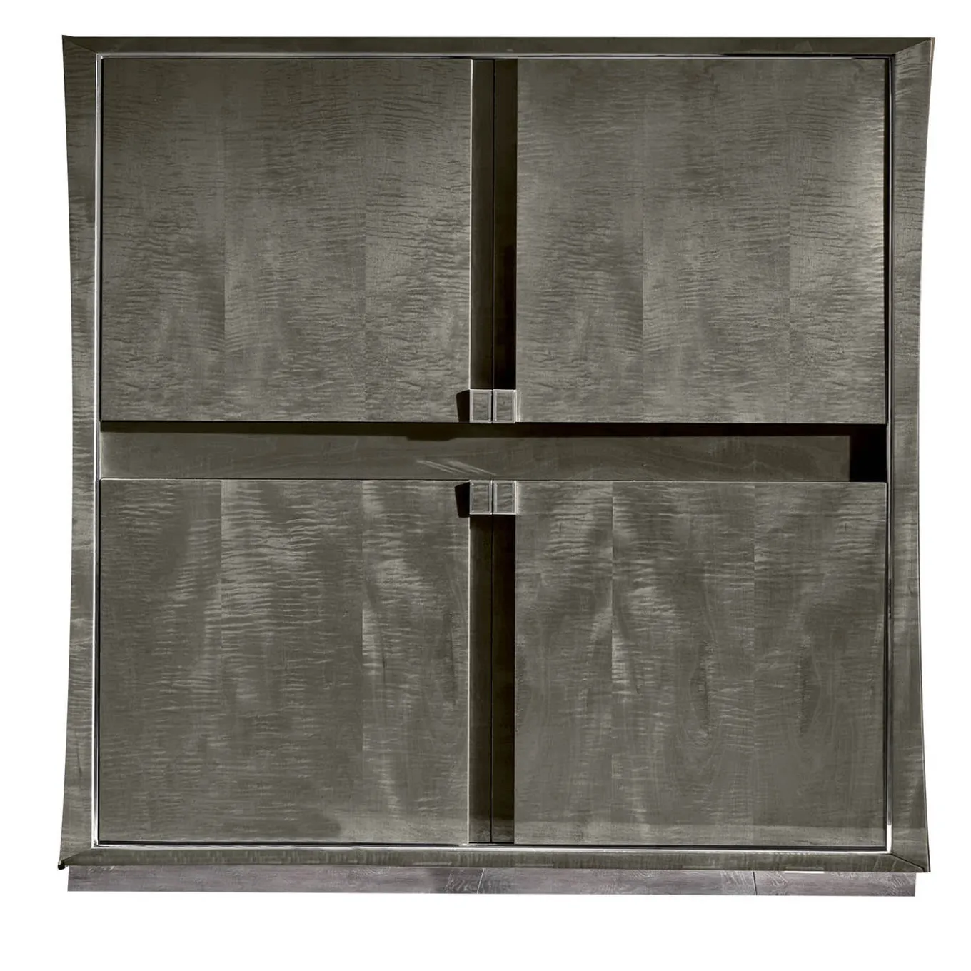 Fashioned of prized figured sycamore here offered in a sophisticated gray finish, this bar cabinet is a cabinetmaking gem brimming with modern refinement. Two sliding doors on the sides add to the hinged ones in the front, which open to reveal elegant lit inner units equipped with a glasses’ holder on the top compartment and perfected by a mirrored glass backing.