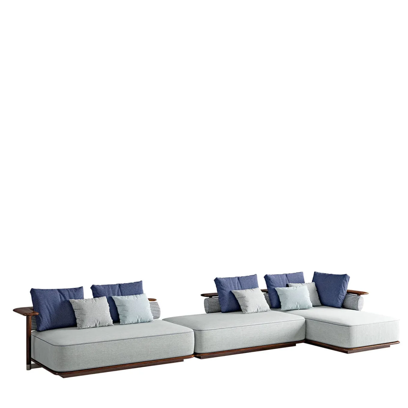 Modular sofa composed of right open end side, chaise lounge, and left closed end side. Structure in high glossy Sapeli Mahogany. Seat with fabric. Roll cushions with fabric. Backrest cushions with fabric. Piping and belts in leather. Metal details satin steel. The price does not include the decorative cushions visible in the photo.