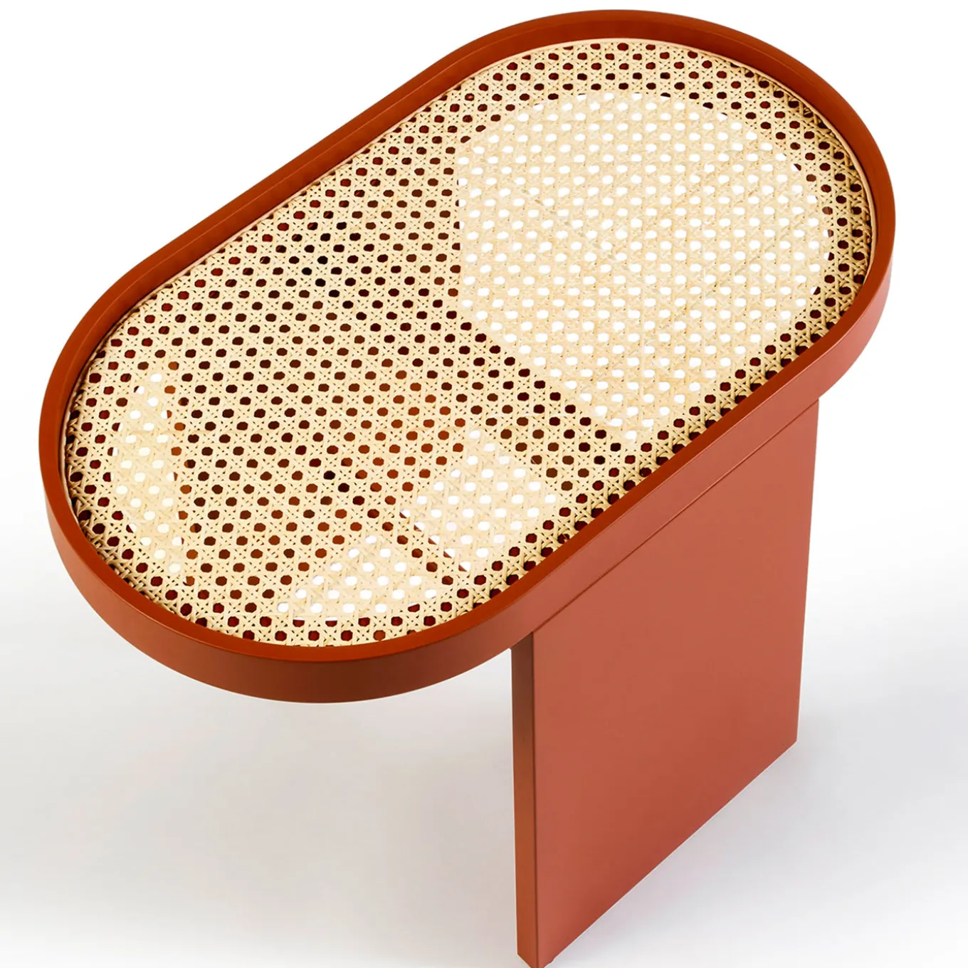 This side table designed by Patricia Urquiola combines elegance with functionality. Made of wood with a distinctive, iridescent lacquer in a modern copper color, this side table balances an oval top with natural cane surface between two imposing rectangular side panels. The lower central rod adds stability to this exclusive piece that is made to order, please contact the Concierge for further details and pricing.