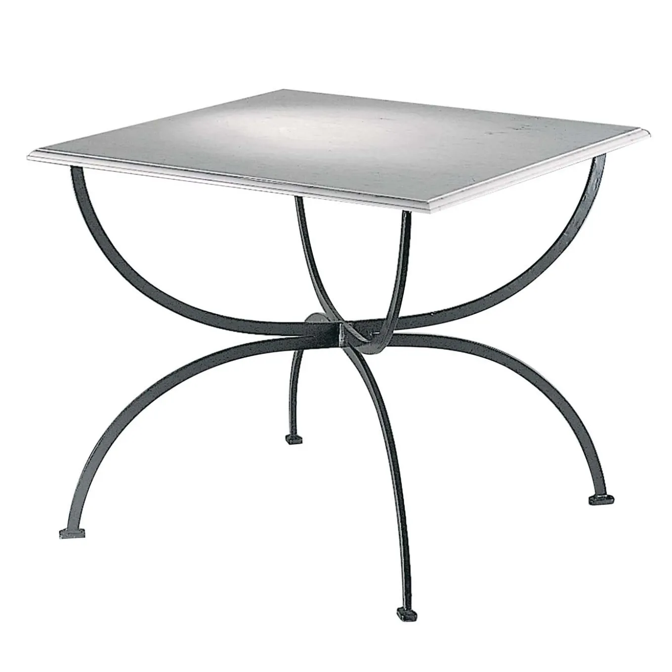 A striking addition to a patio, poolside, or terrace, this table is part of the Piazza Collection and evokes the understated elegance of Tuscan towns’ piazzas. Inspired by traditional styles interpreted in a modern fashion, this table exudes timeless sophistication. The base has crossing semi-circular iron legs supports a square white Carrara marble top. Ideal for outdoor use, the iron is protected by a zinc treatment and a powder-base varnish.