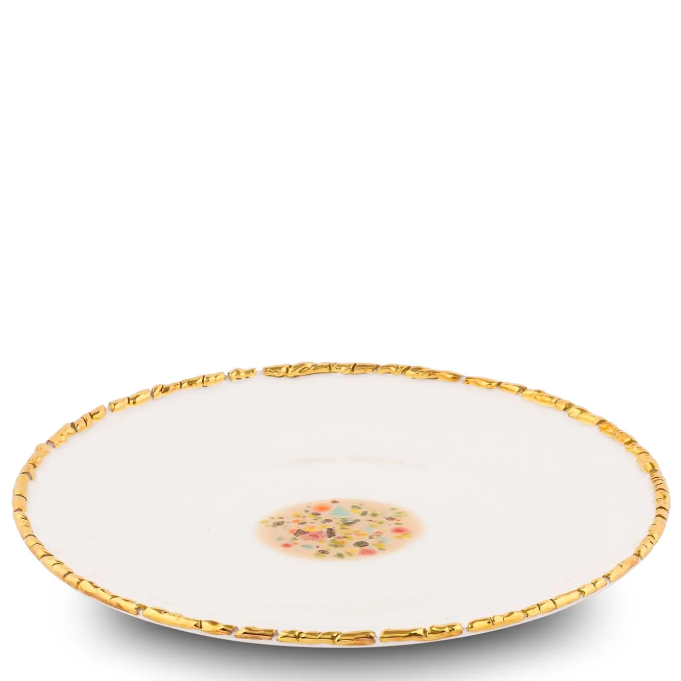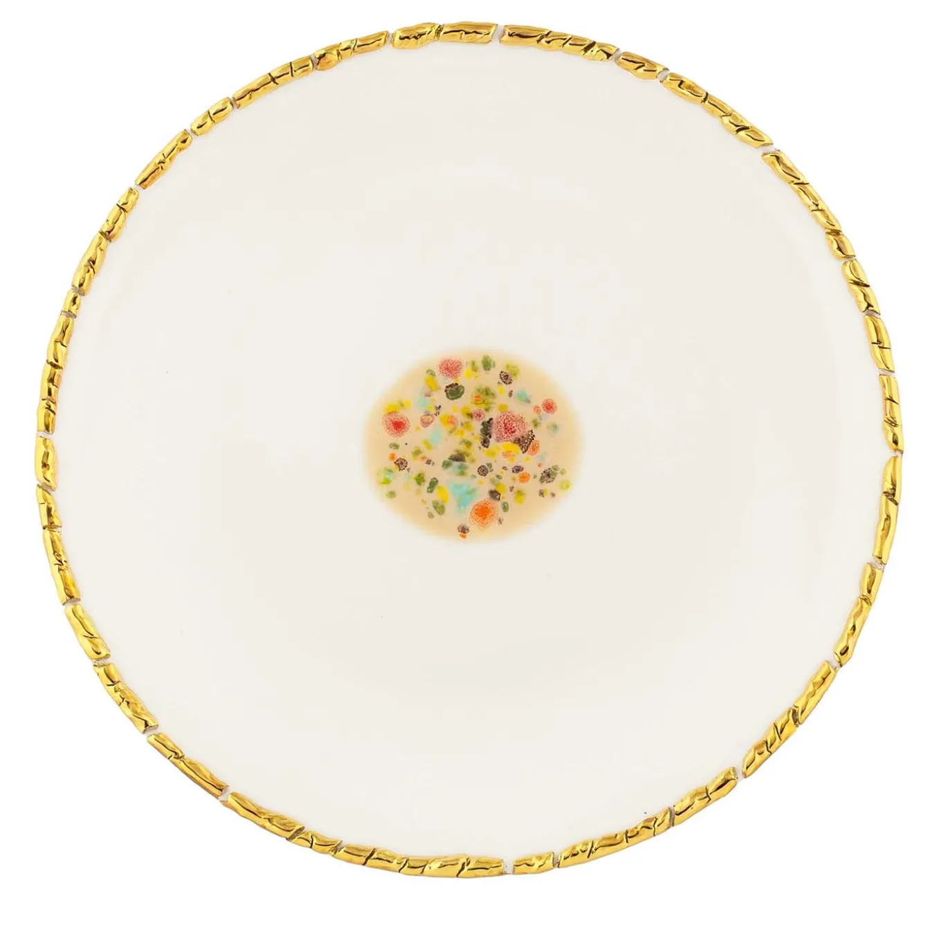The Piazza del Popolo collection is named after a Roman landmark, and inspired by traditional Italian artisanal pottery yet decorated in a personal and elegant key. this Chestnut Dessert Coupe Plate has an original golden craquelé edge emphasizing the elegant white surface and the multicolor dots over the bright sandy center. Due to the presence of real 24-karat gold, it is not suitable for microwaves. Non-aggressive soap and delicate washing are recommended.