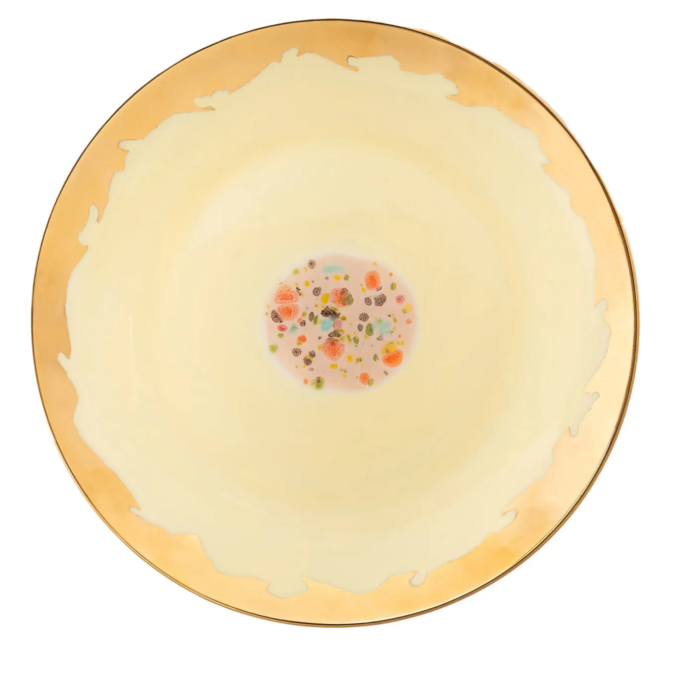 The Piazza del Popolo collection is named after a Roman landmark, and inspired by traditional Italian artisanal pottery yet decorated in a personal and elegant key. These Chestnut dessert plates have a broad golden drop edge emphasizing the bright yellow surface and the multicolor dots over the bright sandy center. Due to the presence of real 24-karat gold, it is not suitable for microwaves. Non-aggressive soap and delicate washing are recommended.