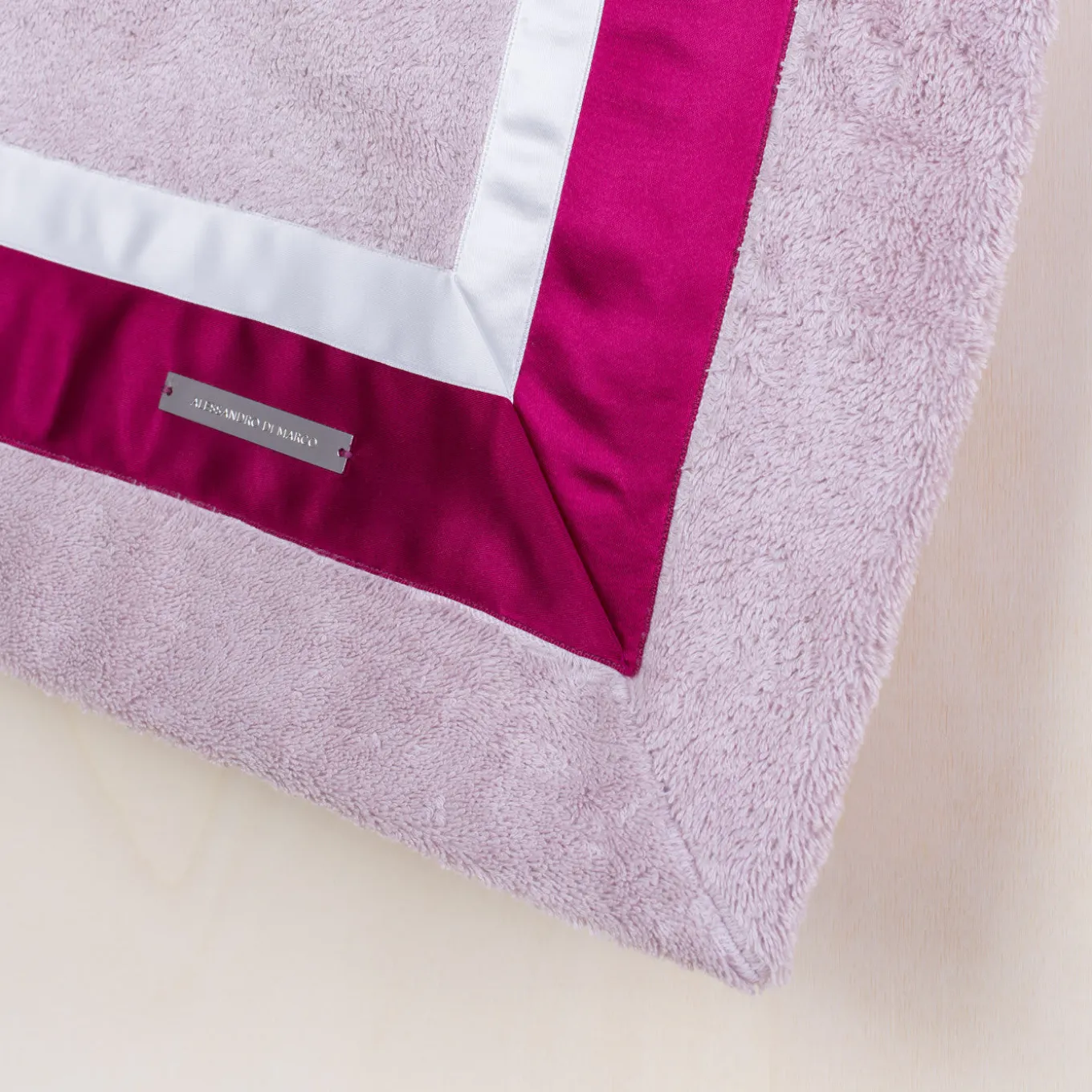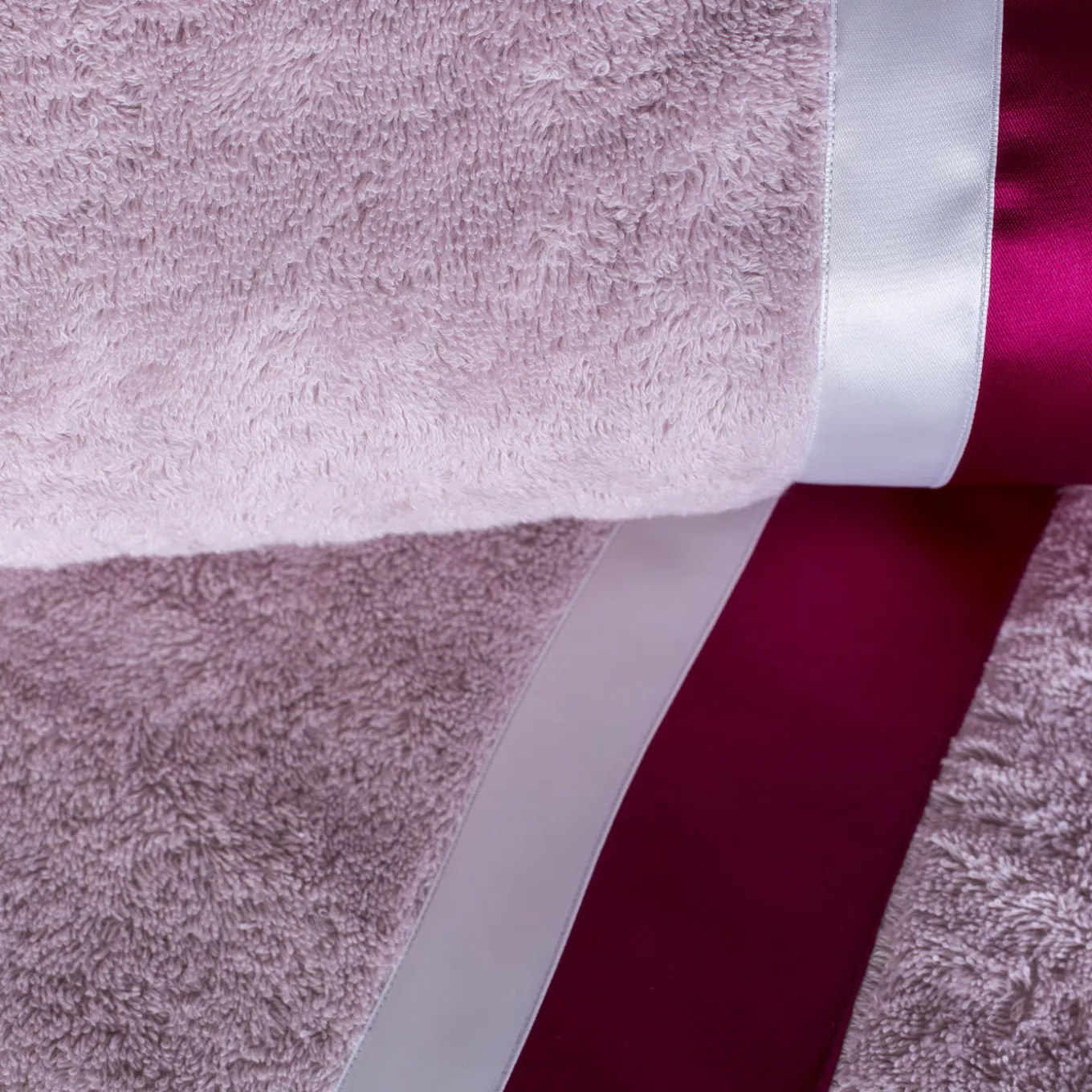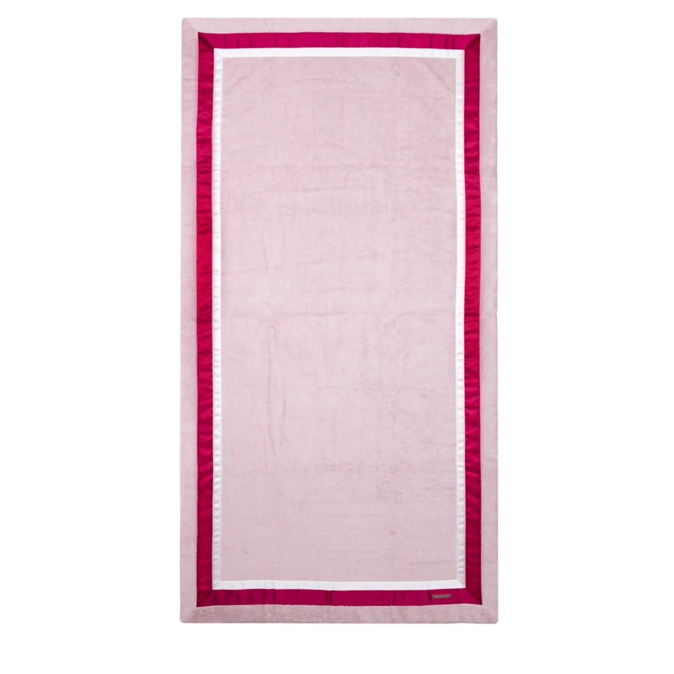 This elegant beach towel in delicate pink is crafted in Egyptian cotton of the finest quality, accented by two satin ribbons that run around its perimeter in cherry red and white. The metal logo plate has been embossed and sports a palladium finish.