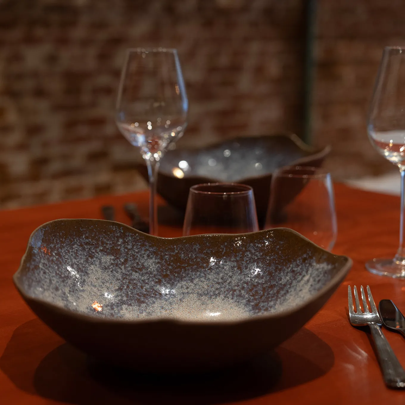 The beauty of the Cosmosis collection lies in the strong contrast between the textured dark red earthenware surface of the outside which is left unglazed and the shiny, deep, orange-speckled pink of the inside glaze resembling the magic of Cosmo’s nebulae. This appearance will give a touch of poetic extravaganza to your dinner table. The small wave-like movements of the rim give it a soft and sensuous appearance. Each piece is unique, and due to handcrafting, slight changes may occur.