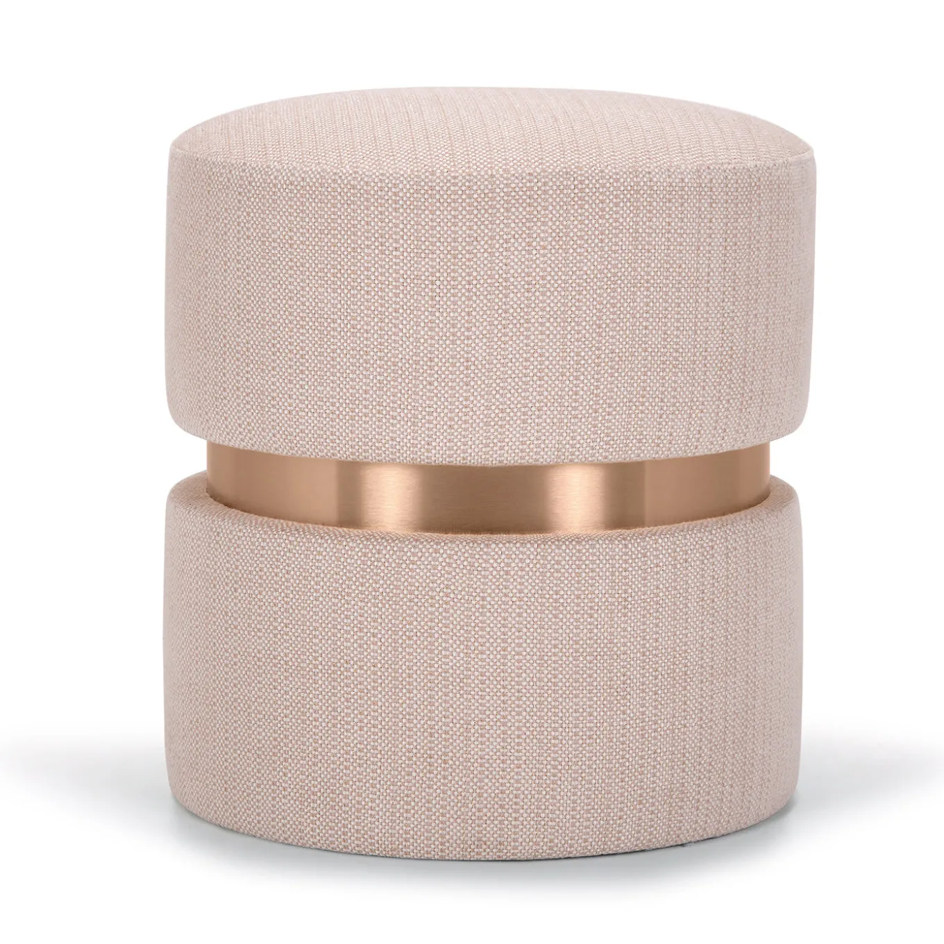 The whimsical Greek nymphs of evening and golden dawn inspired this stylish cylindrical pouf, deftly hancrafted to add a romantic accent to any decor. The two cushions are richly padded to offer utmost comfort, increased by the powder pink jacquard upholstery with bright lurex thread. Outstanding, luminous detail in the central section is in satin copper-finished laminate.