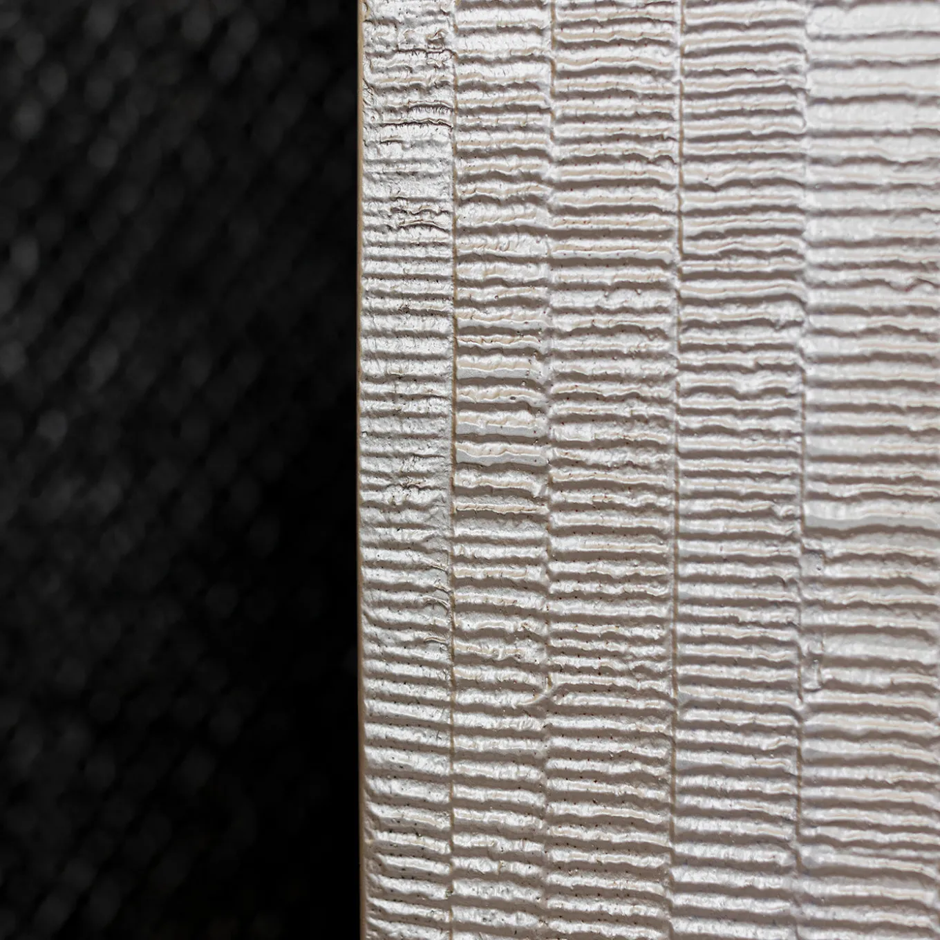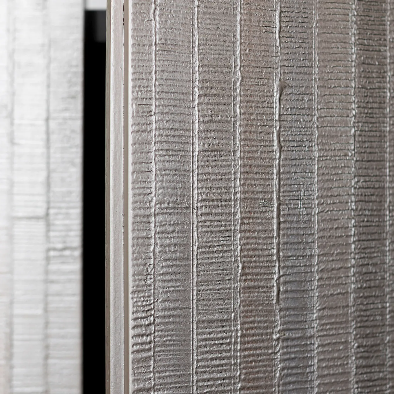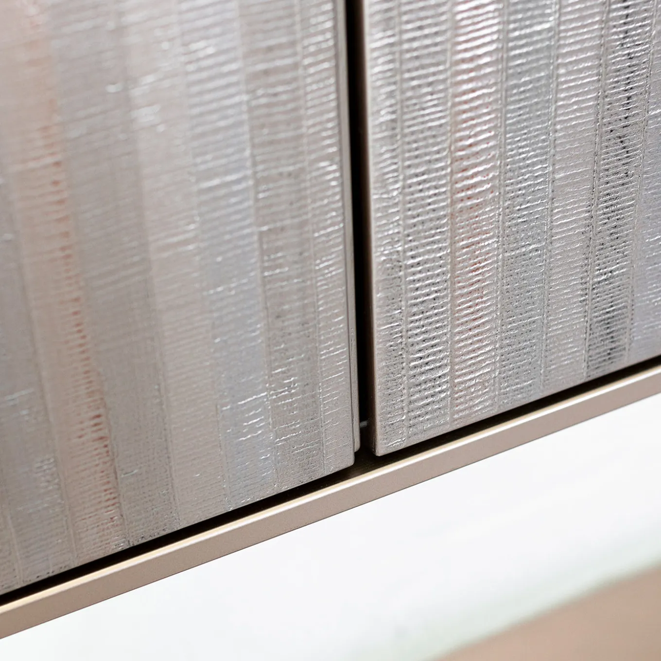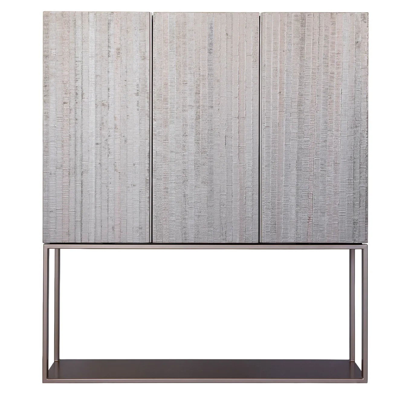 This cabinet features a textured facade in three different shades of pink, combining a pearl-like structure, a metallic base, and finely detailed doors. The interior is finished in black wood with black glass shelves, offering elegant storage and display options. The piece can be customized in size to suit various spaces and preferences, making it a versatile addition to sophisticated interiors.
