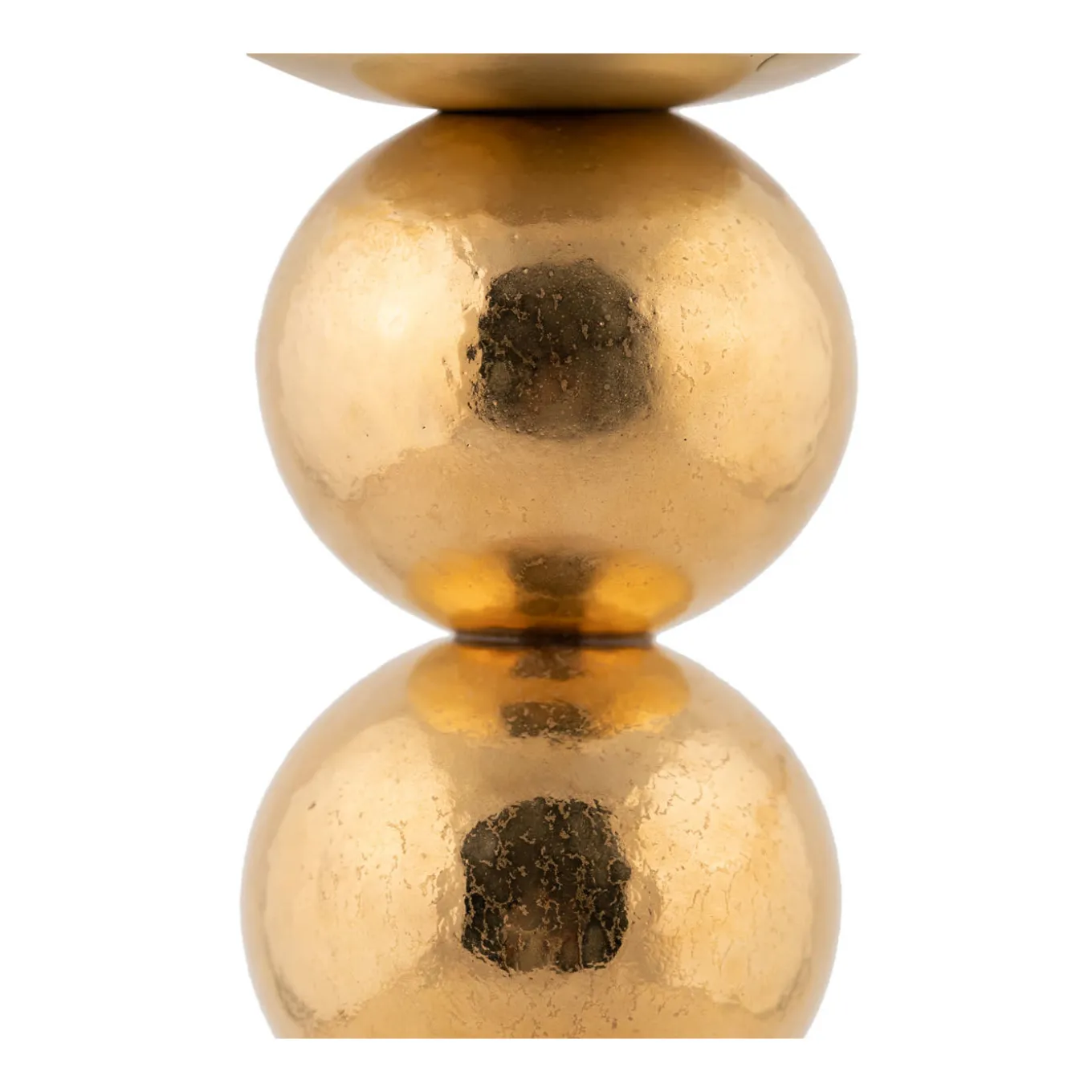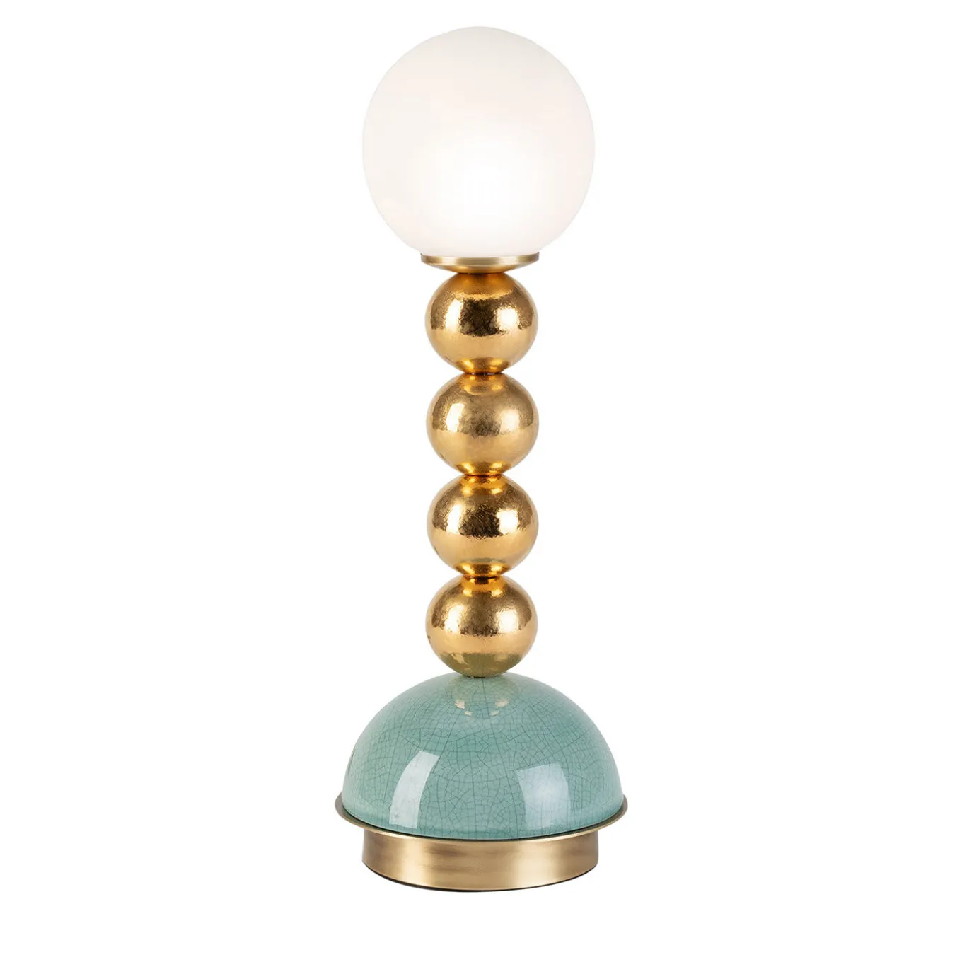 This table lamp features a series of four golden glazed ceramic spheres stacked above a dome-shaped base finished in a delicate turquoise glaze. The spherical satin glass acts as a diffuser, softening the light for ambient illumination. This design highlights elegant shapes and volumes, offering a refined accent piece for any tabletop. Ceramic is available in various color combinations. Design by La Récréation – P.Angelo Orecchioni Arch.