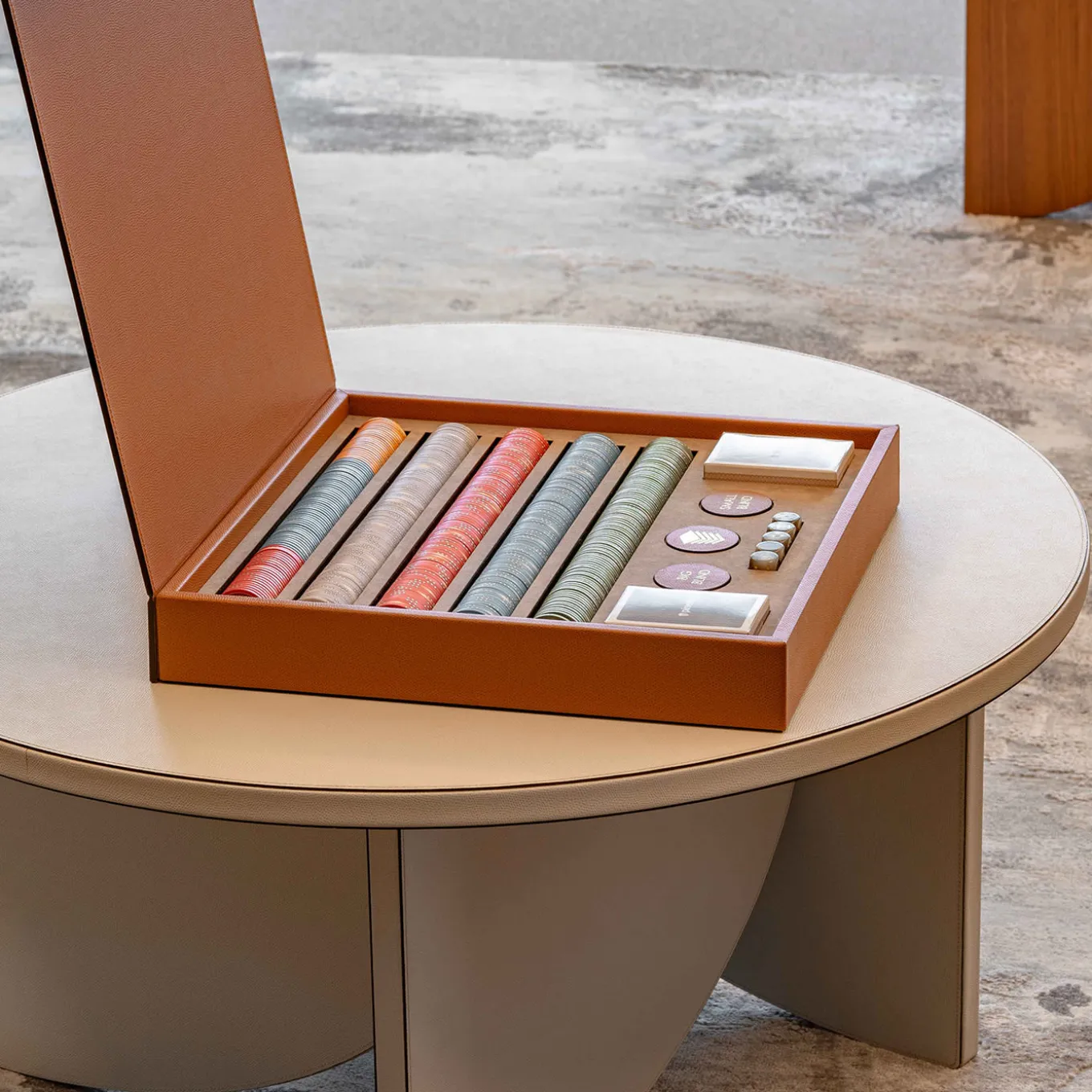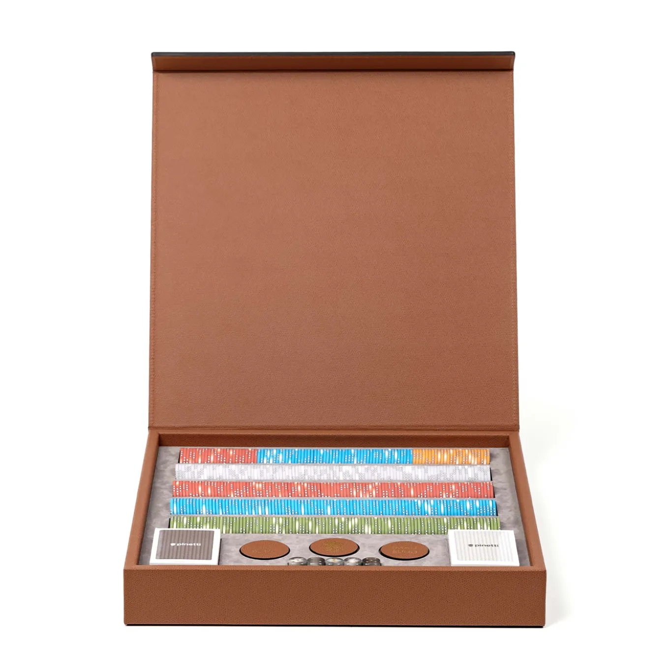 Elevate the poker nights with the exclusive Poker set, housed in a luxurious wooden box with a magnetic closure lid. Crafted entirely from genuine calf leather, this professional set includes 500 ceramic poker chips, 2 Pinetti card decks, 5 dice, a dealer button, and 2 leather coins. Experience a gameplay like no other with this exceptional set.