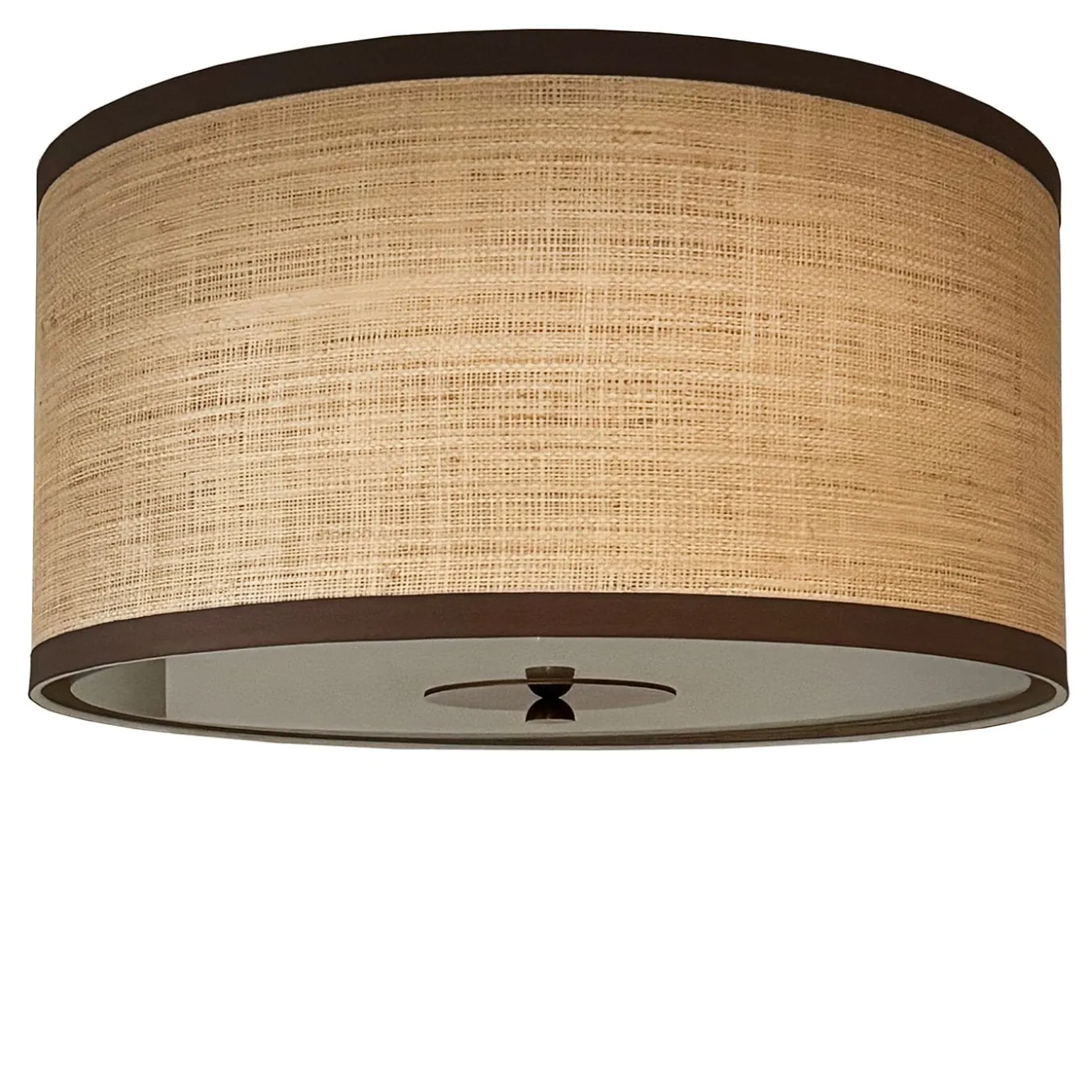 A refined ceiling lamp featuring brass details and an elegant satin glass closure. The raffia lampshade, enhanced with decorative brown bands, adds a touch of warmth and natural charm, making it perfect for adding both style and brightness to any space. Bulb not included.