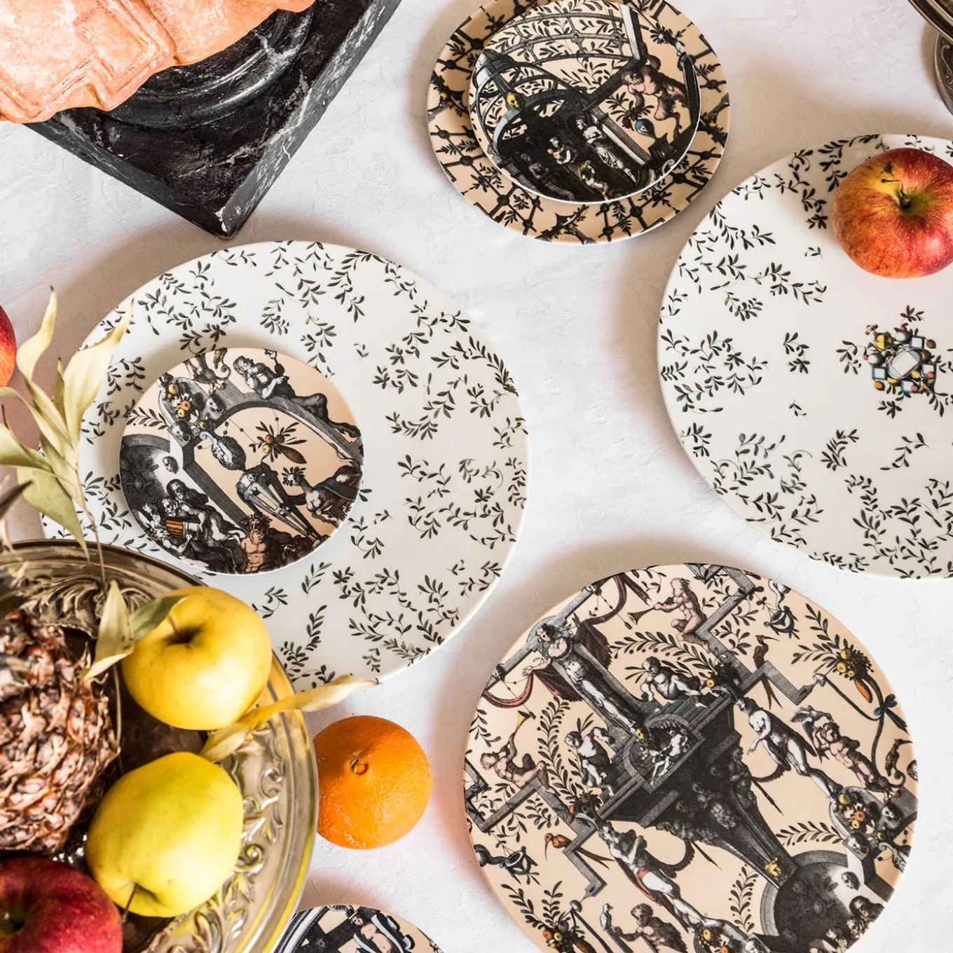The new Pompei porcelain collection brings back the Grottesche wall decoration in a contemporary key. Ancient designs are taken and declined on the different formats of the mise en place in such a way as to create elegant and unique plays of overlapping. Natural elements, anthropomorphic figures, jewelry and architecture come together to create stories, decorations and geometries. This collection manages to be transversal, adapting to both regal and elegant tables and more formal settings.