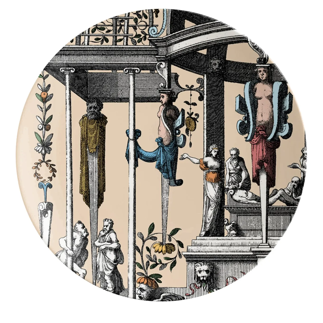 The new Pompei porcelain collection brings back the Grottesche wall decoration in a contemporary key. Ancient designs are taken and declined on the different formats of the mise en place in such a way as to create elegant and unique plays of overlapping. Natural elements, anthropomorphic figures, jewelry and architecture come together to create stories, decorations and geometries. This collection manages to be transversal, adapting to both regal and elegant tables and more formal settings.