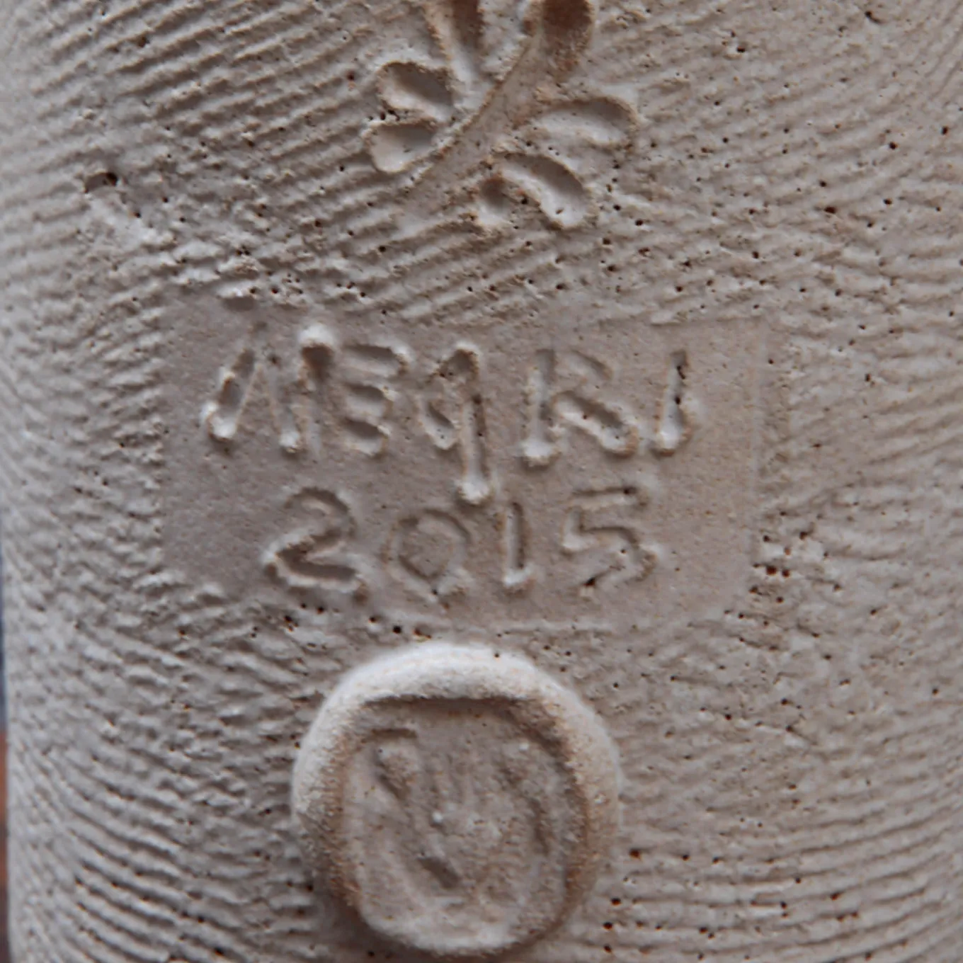 This exquisite ceramic sculpture is crafted using the coiling technique and cooked at 2190 degrees Fahrenheit, then finished with cinder-based enamels. The inside is hollow, like a vase and the base is in iron. This one-of-a-kind piece represents a water carrier and symbolizes the sacredness of the element of water.
