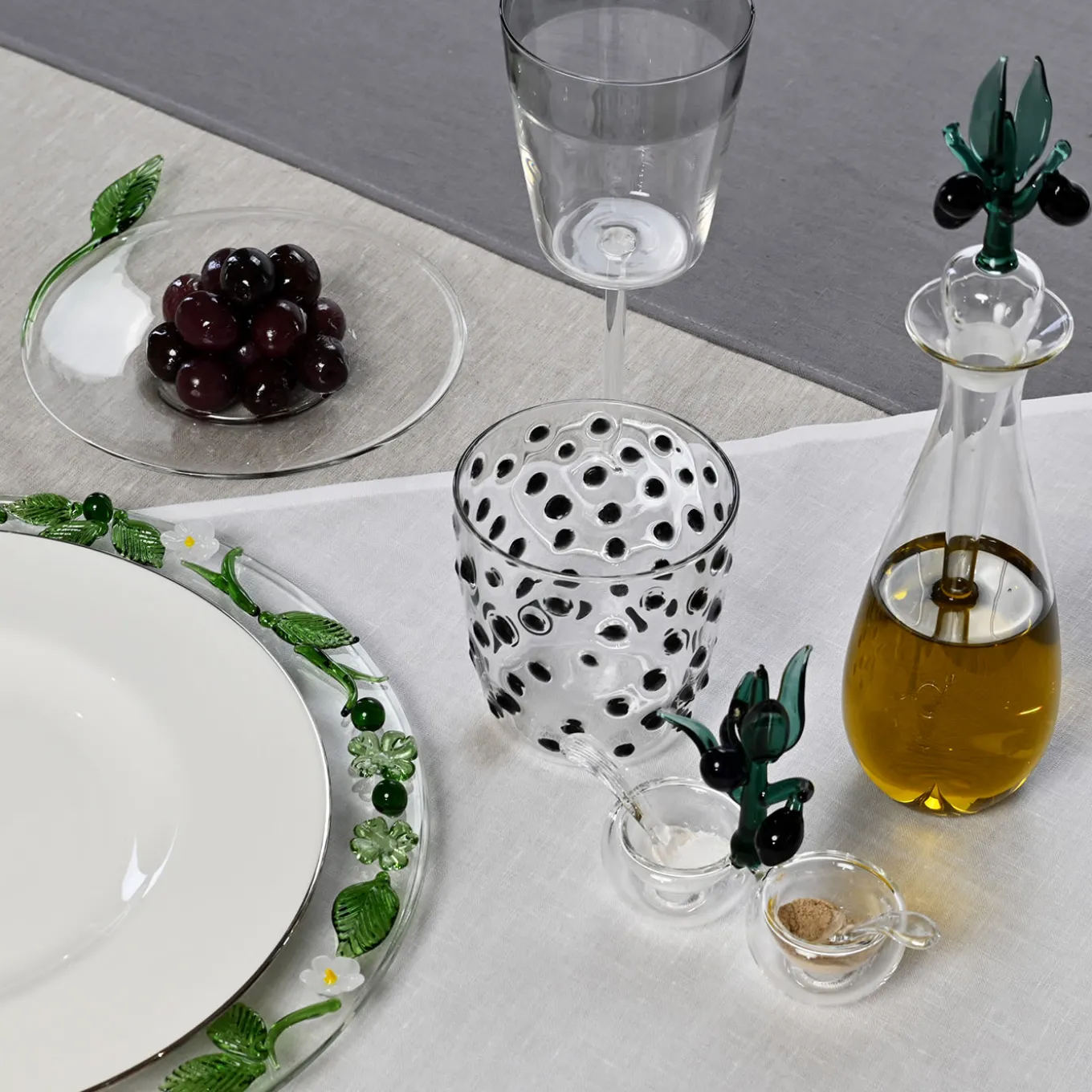 This delicious salt and pepper set consists of two small transparent glass containers, divided by a colored olive subject. The subjects always present in the Casarialto line, come out of glasses and carafes, to rest on the top of containers and containers. This set is a new subject for Casarialto, which completes the table line, always elegant and sophisticated with a small eccentric touch. Ideal matched with Portofino Oil Bottle. Handcrafted in Venice, Italy.