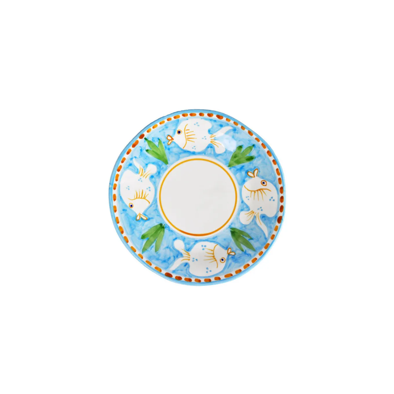 Fashioned of fine ceramic, this fascinating set inspired by marine atmospheres – hence the name Poseidon, the Greek god of the sea – comprises six dinner plates (ø 29 cm), six soup plates (ø 23 cm), and six dessert plates (ø 23 cm). Each piece is decorated with white fish on a turquoise background alternating with green bunches of seaweeds. The further, graceful ocher details enrich the decorative value of the set.