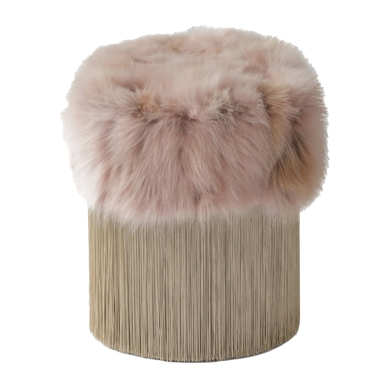 Lorenza Bozzoli Couture presents a limited-edition collection characterized by an extremely soft design, eclectic and distinctly retro. The new Fur Collection offers the Couture iconic pieces in a furry version with colours inspired by the seventies and sophisticated fur upholstery that emphasize the enveloping and smooth shapes for a cocoon effect. Pouf in powder pink coyote fur, warm and soft, with beige fringes. Structure and legs in beech wood. Limited edition of 10 pieces.