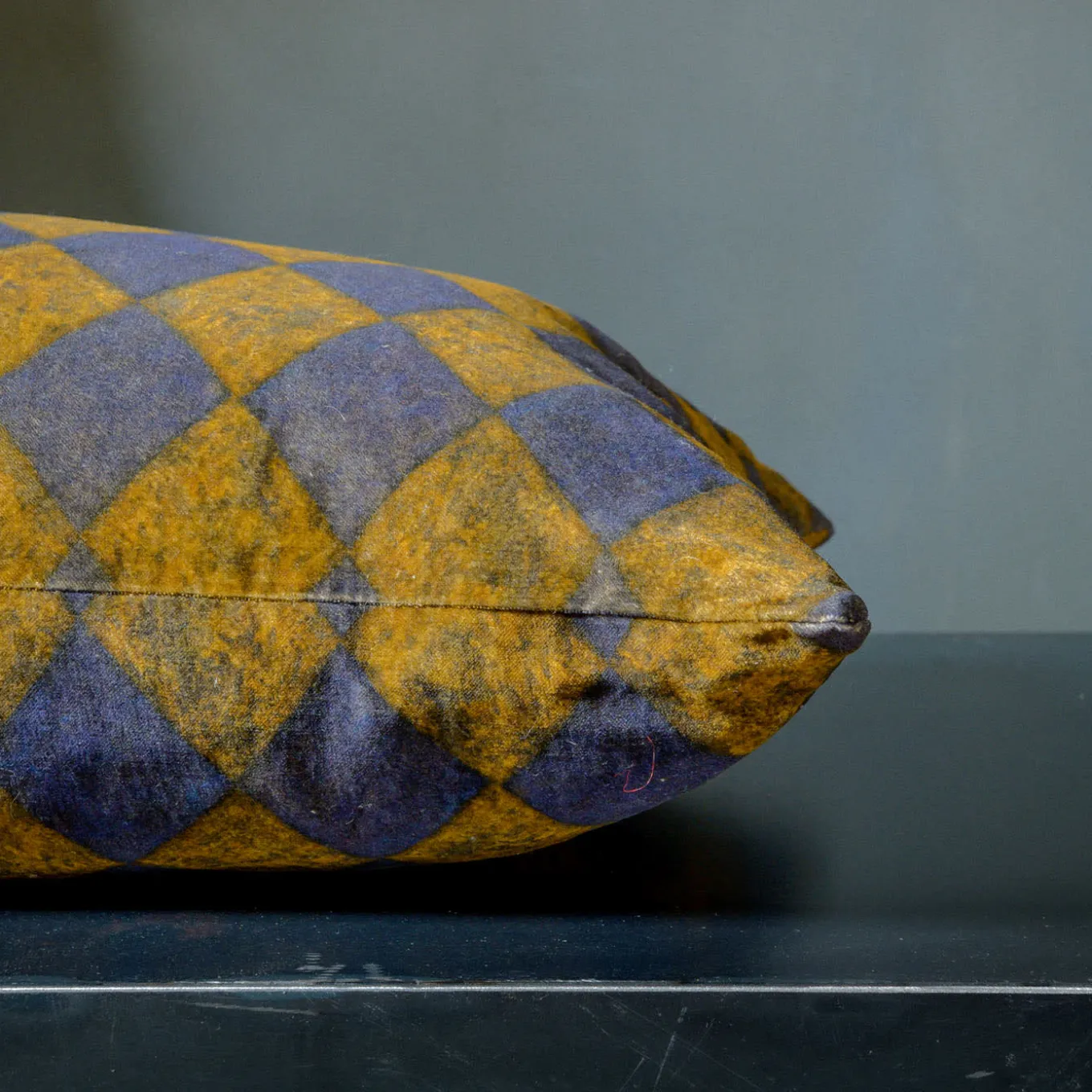 Vibrant in its chromatic contrasts and hypnotizing in its geometric design, this rectangular cushion is sure to strike with its bubbly personality. Shades of blue and yellow mark the motif, which lends an intriguing mosaic-like look to the soft velvet cover. A square version is also available in the Artemest catalog.