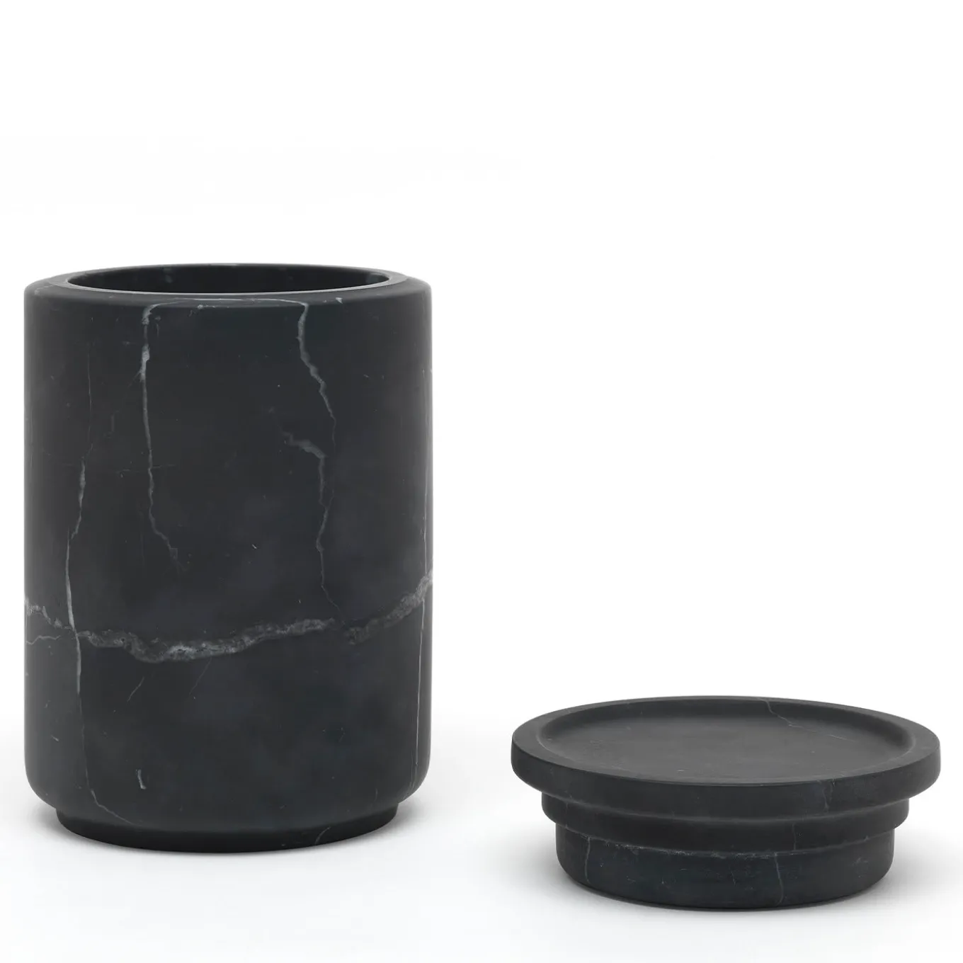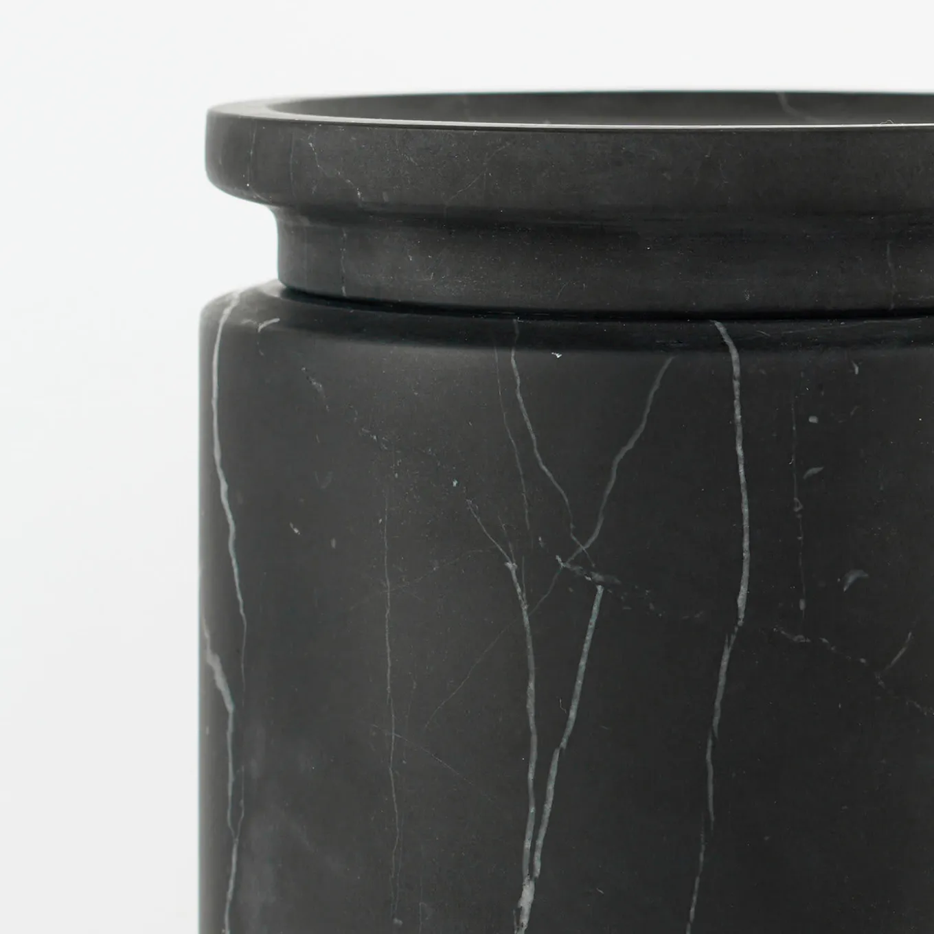 The use of prized black Marquina marble lends mysterious charm and visual depth to this striking jar, which will make for a superb addition to any contemporary kitchenware collection. Consisting of a dented lid and a cylindrical container with a tapered base, its cylindrical body bestows a smooth and opaque black surface with subtle, seductive white-gray veins that are one-off characteristics, making each piece entirely unique. Please note that marbles and stones are natural materials and they can differ also if coming from the same quarry or the same block. The product shown may differ from purchased items. Every piece is unique.