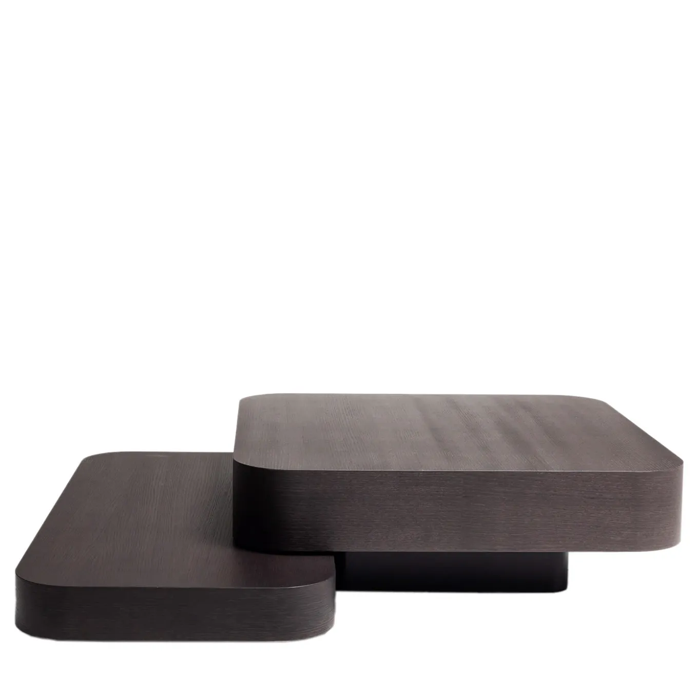 Squared volumes softened by generously rounded corners distinguish the bold look of this set of two accent tables. Perfect for complementing refined contemporary homes, it features a low rectangular table (120W x 60L x 13H cm) and a taller square table (90W x 90L x 32H cm), both fashioned of grey-stained oak and finished in an intense shade. The tables have detached frames allowing for separate displays. The square coffee table top is also available in different marbles.