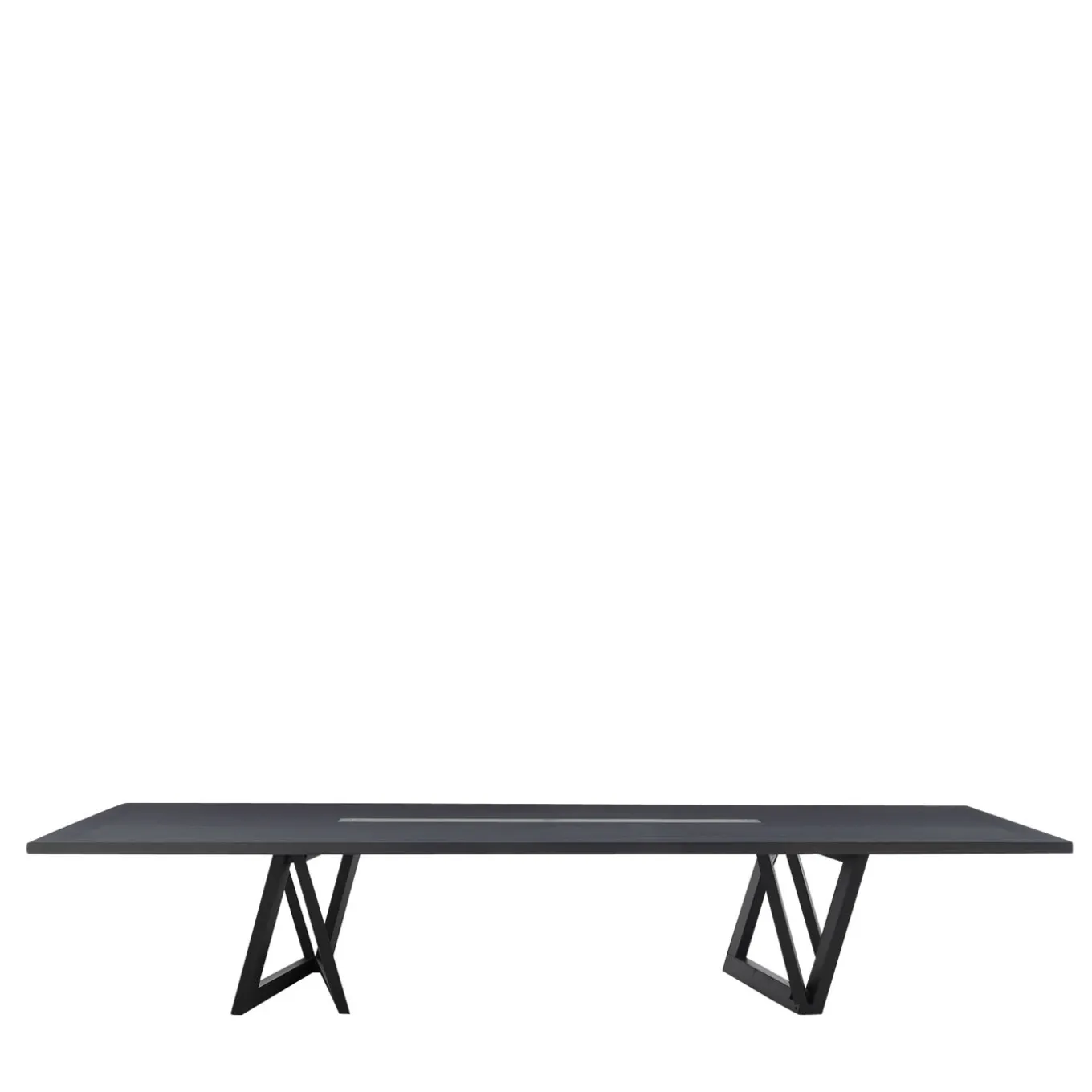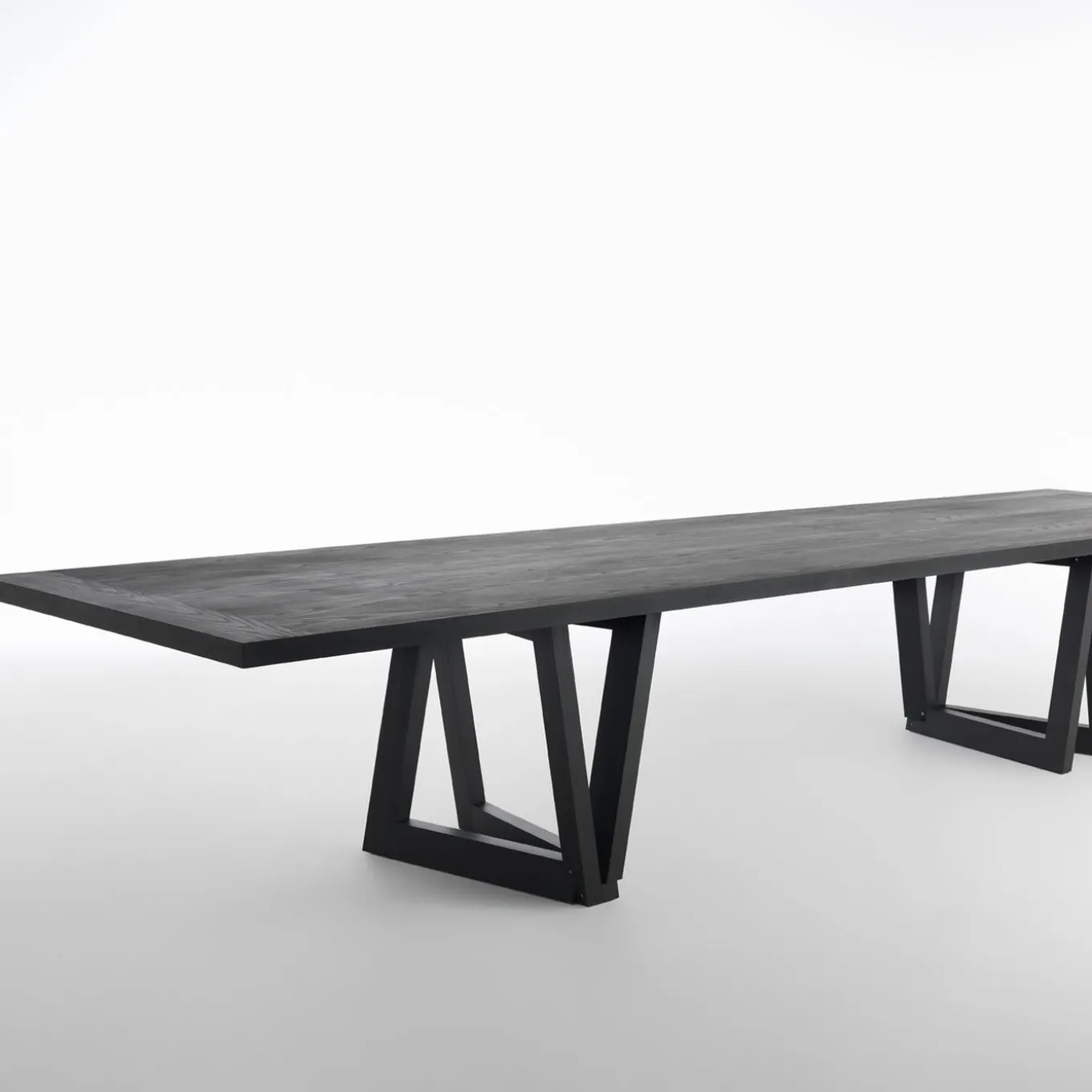 A sculptural work of art boasting an interplay of geometric shapes and perspective, this dining table is a unique, distinctive piece of functional decor. Entirely made of solid ash wood with a mocha-stained finish and internally reinforced with lengthwise metal supports, it is a large and functional table of a striking appearance exquisitely designed by Dror. The top dimensions can be customized upon request, please contact the Concierge for details.