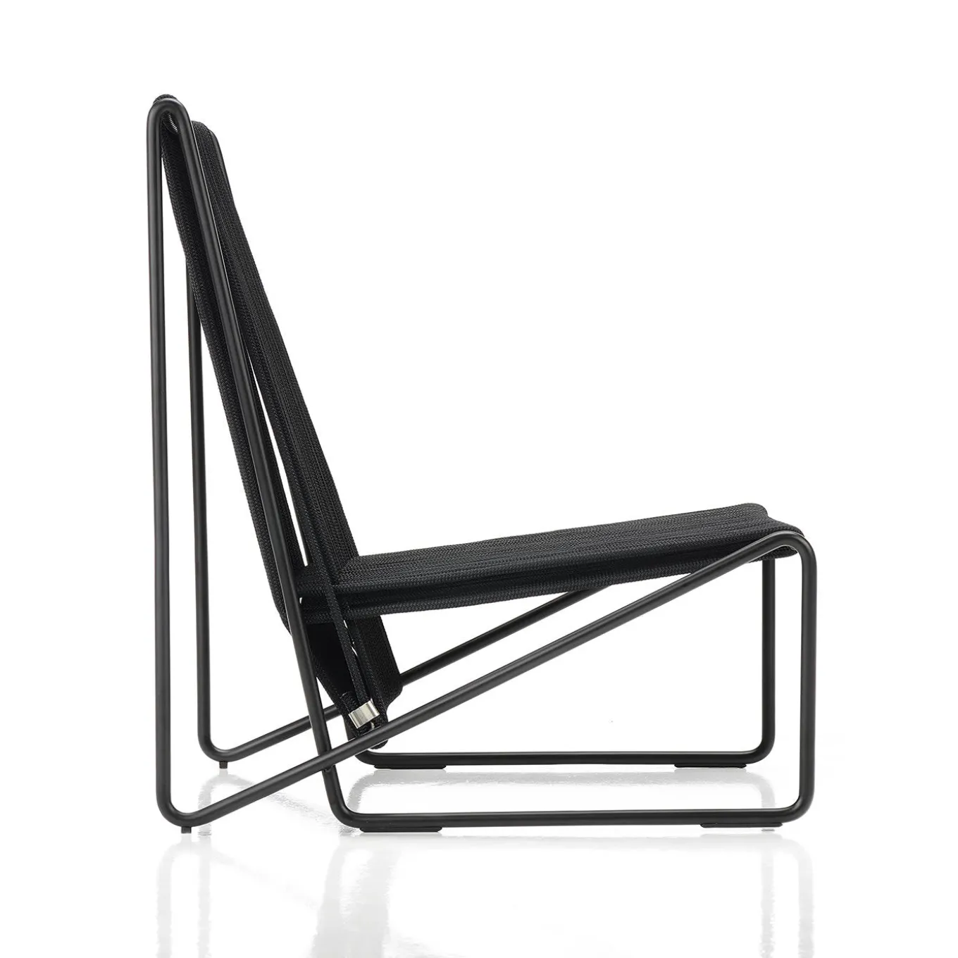 This lounge chair is made from a galvanized-steel tubular structure that has been painted black. Its seat and back are covered in woven black nautical rope. The item sits low to the ground and features a slightly inclined back, making it perfect for outdoor use, including in a spa or wellness retreat. Other colors of nautical rope are also available.